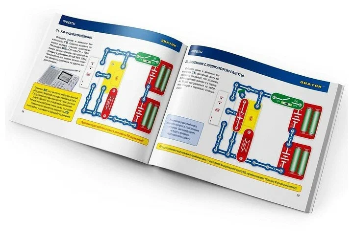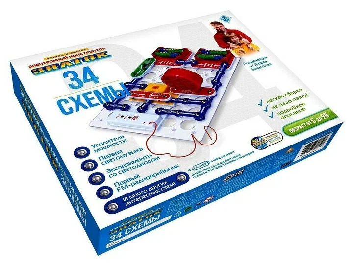 Конструктор Знаток 34 схемы – это первый помощник вашего ребенка при изучении современных технологий. С давних времен всем известно, что обучение в игровой форме является одним из самых лучших способов привить ребенку всевозможные навыки, поэтому при создании конструктора мы ставили пред собой цель показать детям насколько может быть интересной наука. В набор входят разные элементы, являющиеся отдельными частями такой техники, как фотоаппараты, телефоны, компьютеры и телевизоры. С помощью электронного конструктора Знаток 34 схемы можно сделать светомузыку, FM-радиоприемник, усилитель мощности или провести другие эксперименты, поскольку для этого в наборе есть все необходимое: выключатели, светодиоды, транзисторы, резисторы, звуковые динамики, элементы питания, электролампы и проводники. Для создания схем разработано специальное пособие, в котором все изложено на доступном уровне. Соединение всех элементов осуществляется при помощи планшета и клемм, поэтому нет необходимости спаивать детали.