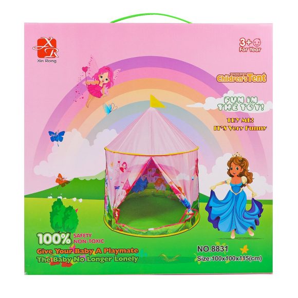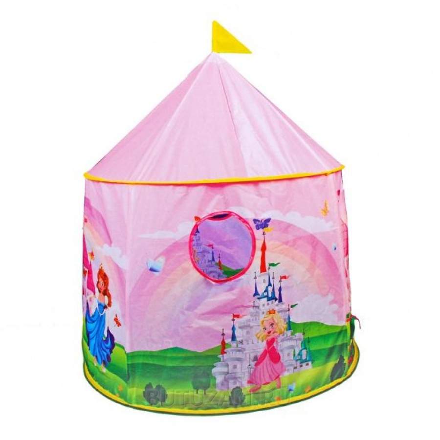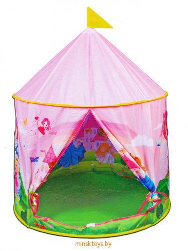 Палатка выполнена в форме замка в розовом цвете. В замке-палатке имеются окошки , а дверка собирается и завязывается по бокам с помощью верёвочек. В палатке есть днище — пол, что делает ее еще более комфортной для игр деток. Палатка легкая и прочная. Легко собирается и компактно складывается, удобна для транспортировки и хранения.