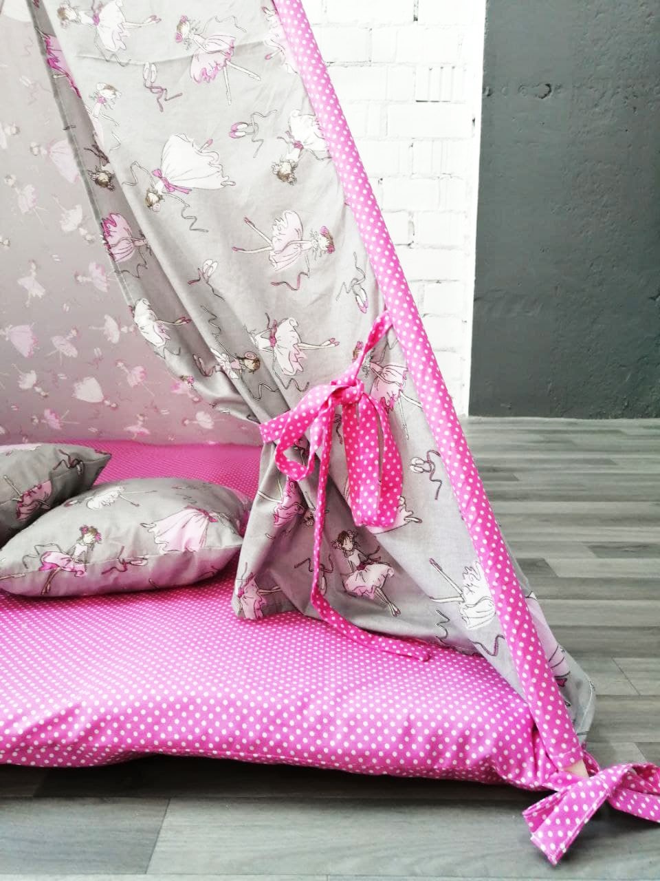 Вигвам Балеринки, Minsktoys mi1014 станет самым любимым местом для игр у вашего ребенка. Вигвам выполнен из 100% хлопка с любовью в каждой строчке. В каждом комплекте есть сам вигвам, опоры, подушки, инструкция по сборке ,мягкий коврик ,система антискладывания. Сборка простая и быстрая.