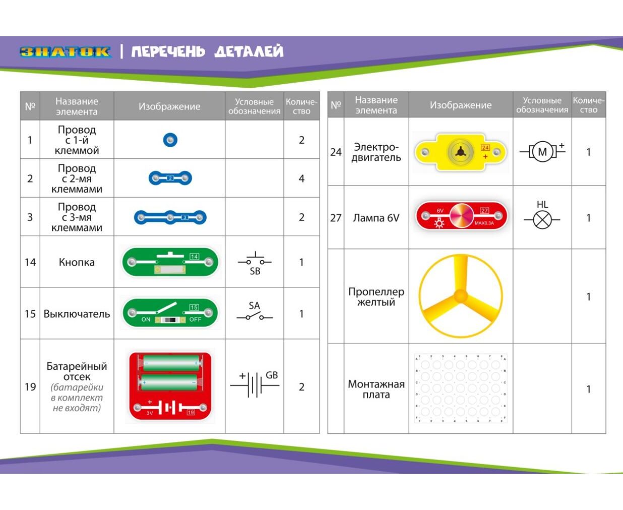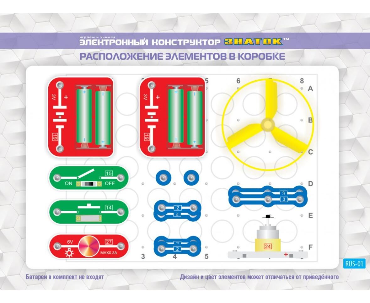 Помимо этого в «Руководстве пользователя» вы найдёте перечень элементов конструктора. Для удобства собирания деталей в коробку мы приводим схему расположения элементов.