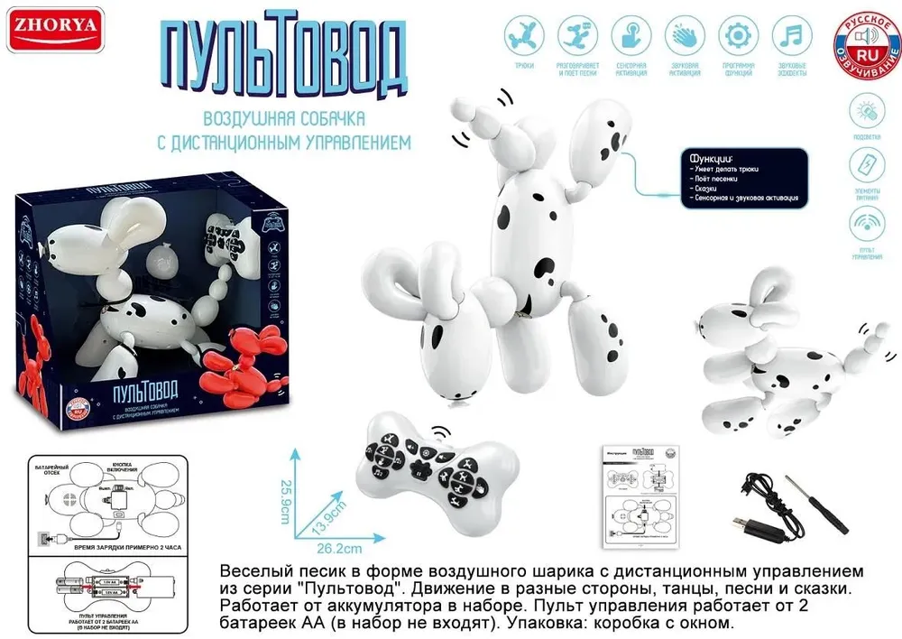 Веселый песик в форме воздушного шарика с дистанционным управлением из серии Пультовод. Движение в разные стороны, танцы, песни и сказки. Работает от аккумулятора (в комплекте). Пульт управления работает от 2 батареек АА (в комплект не входят).
