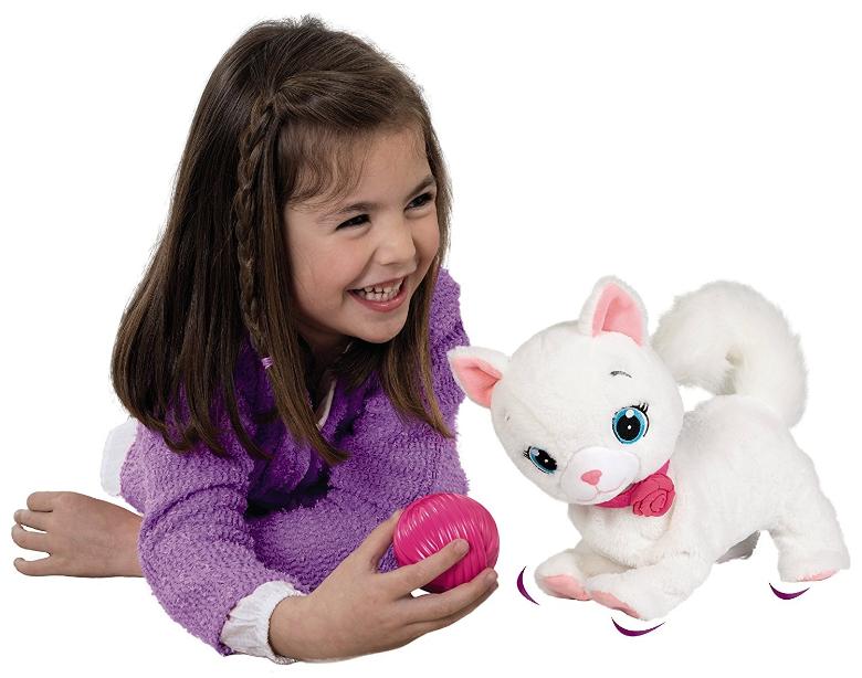 Умный игрушечный питомец доставит массу удовольствия детишкам, ведь он всегда отзывается на голос хозяина, поворачивая голову к источнику звука. А сколько забавных моментов доставит ребенку наблюдение за веселой игрой милого животного с ярким клубочком!