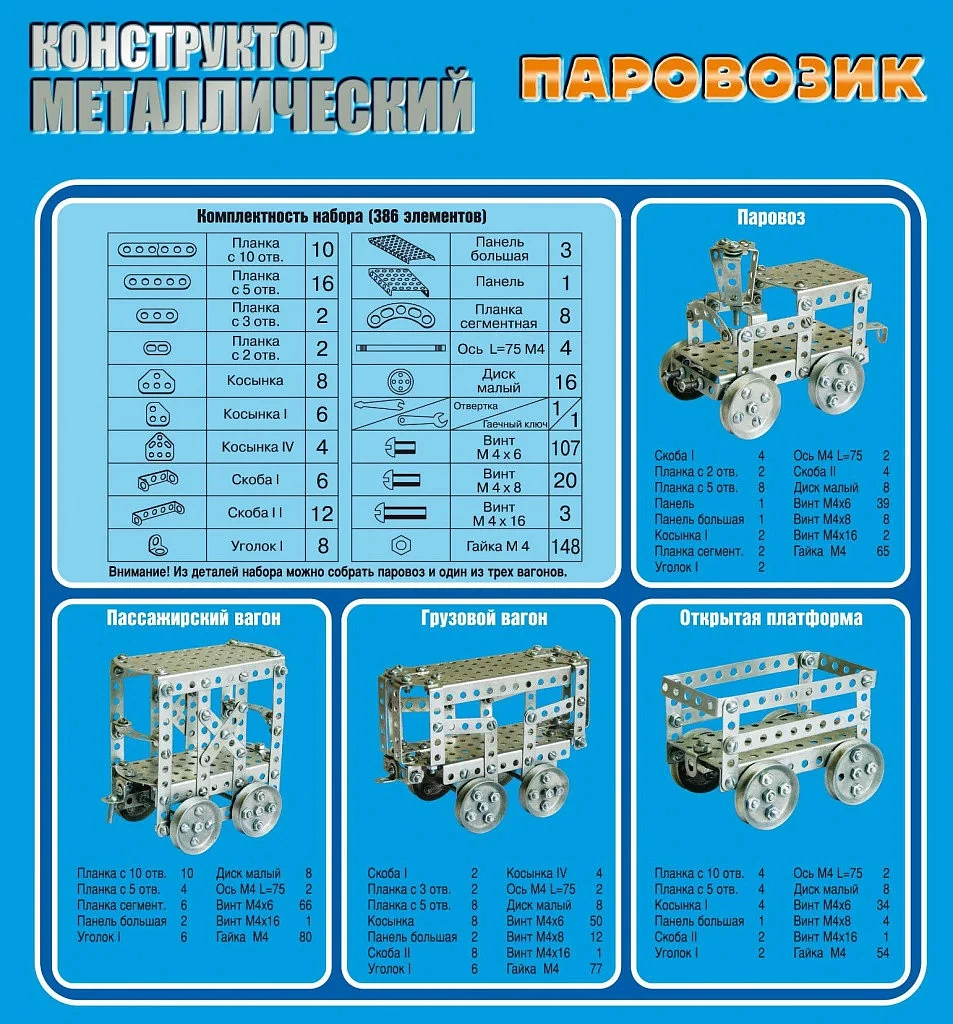 Конструктор "Паровозик" от торговой марки "Десятое королевство" представляет собой классический металлический конструктор. Он позволит собрать паровоз и вагон. Предлагаются три варианта сборки вагона: пассажирский, грузовой, открытая платформа. Представленные модели являются только примером, так как конструктор раскрывает перед ребенком неограниченные возможности моделирования и создания своих собственных моделей. Он отлично развивает конструкторское, инженерное мышление.