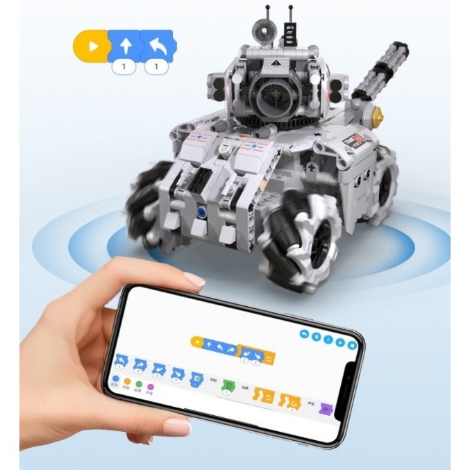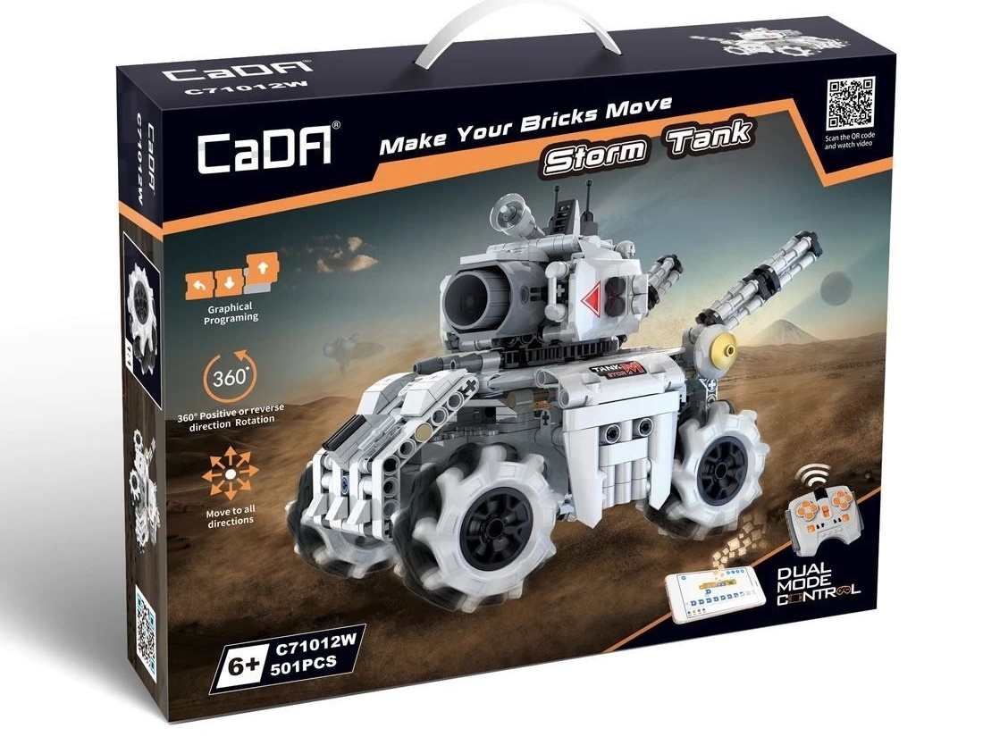 Конструктор Cada Программируемый Танк Шторм (501 деталей, пульт, электропривод) - C71012W - это радиоуправляемый конструктор Cada deTech Программируемый Танк Шторм с пультом управления 2.4GHz. В набор входят элементы для сборки радиоуправляемого танка и сам пульт. В приложении вы можете запрограммировать танк, задавая ему последовательность движений. Помимо деталей корпуса и колес, в комплект входят 2 электродвигателя и приемник, батарейный отсек.