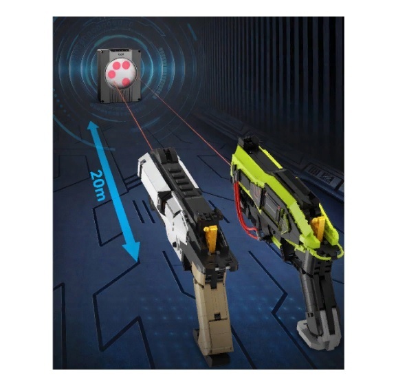 Собери собственный интерактивный лазерный тир: действующая разноцветная мишень реагирует на попадание светового луча от каждого из двух пистолетов фантастического дизайна, ярких цветов, удобно лежащих в руке. Включайте мишень, взводите предохранитель и вместе с друзьями устраивайте соревнования на меткость и скорость стрельбы в собственном лазерном тире с расстоянием до 20 метров.