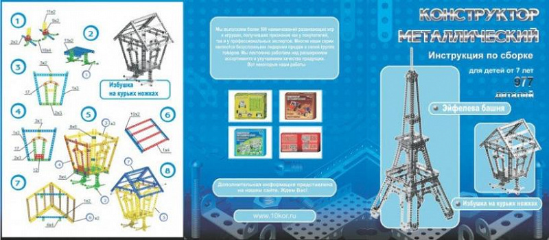 Этот железный конструктор является одним из наиболее больших и габаритных металлических конструкторов. И "детским" этот набор можно назвать достаточно условно, с некоторыми оговорками. Первоначально металлический конструктор "Эйфелева башня" состоял из 893-х деталей, затем имел в своем составе 909 деталей и, наконец, в сегодняшнем исполнении, имеет 977 деталей. В новом виде этот конструктор избавлен от длинных, неудобных и недостаточно прочных, по отзывам покупателей, деталей. Совершенно другой стала и схема сборки, сейчас она цветная и более подробная. Как и изначально, так и сейчас, конструктор позволяет собрать или "просто избушку" или макет Эйфелевой башни высотой 78 сантиметров. Советуем начинать с избушки, потому, что собирать и разбирать ее меньше по времени, а самое главное, разбирать не так жалко. Ведь спорным остается только 100% сходство нашей Эйфелевой башни с оригиналом, узнаваемость присутствует точно, и уже не одну детскую украшает наша металлическая конструкция как память о "трудовом подвиге".