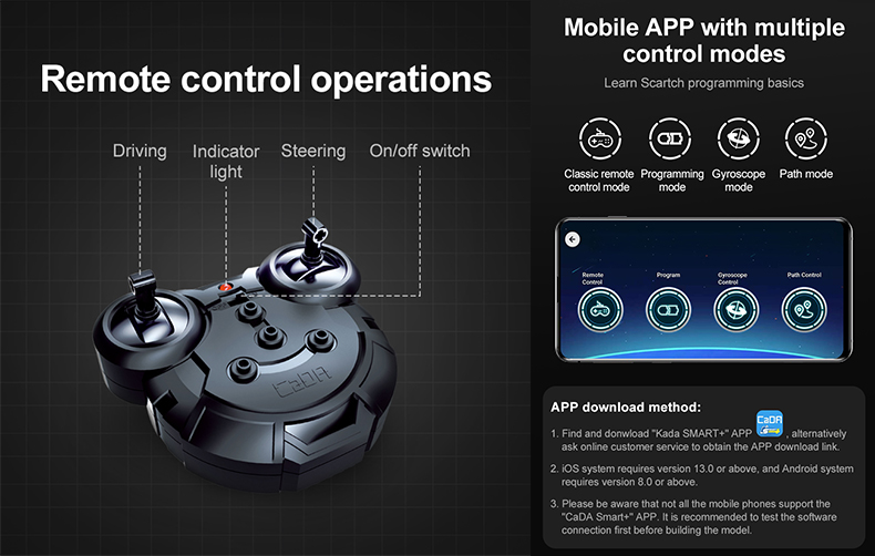 Данный конструктор имеет возможность программирования движения через мобильное устройство, с мобильным устройством машинка связывается по средствам Bluetooth.