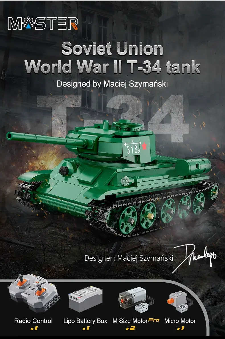 Танк Т34 на радиоуправлении конструктор Cada Technic C61072 Модель легендарного совецкого танка Второй мировой войны очень реалистичный. Зелёный цвет корпуса, топливные баки и выхлопные трубы в задней части кузова, бронированные шторки над гусеницами, люки механиков и командира, пулемет и прожекторы в носовой части боевой машины. Электромоторы обеспечивают движение гусениц и разворот танка на месте, а так же вращение башни на 360 градусов в обе стороны.