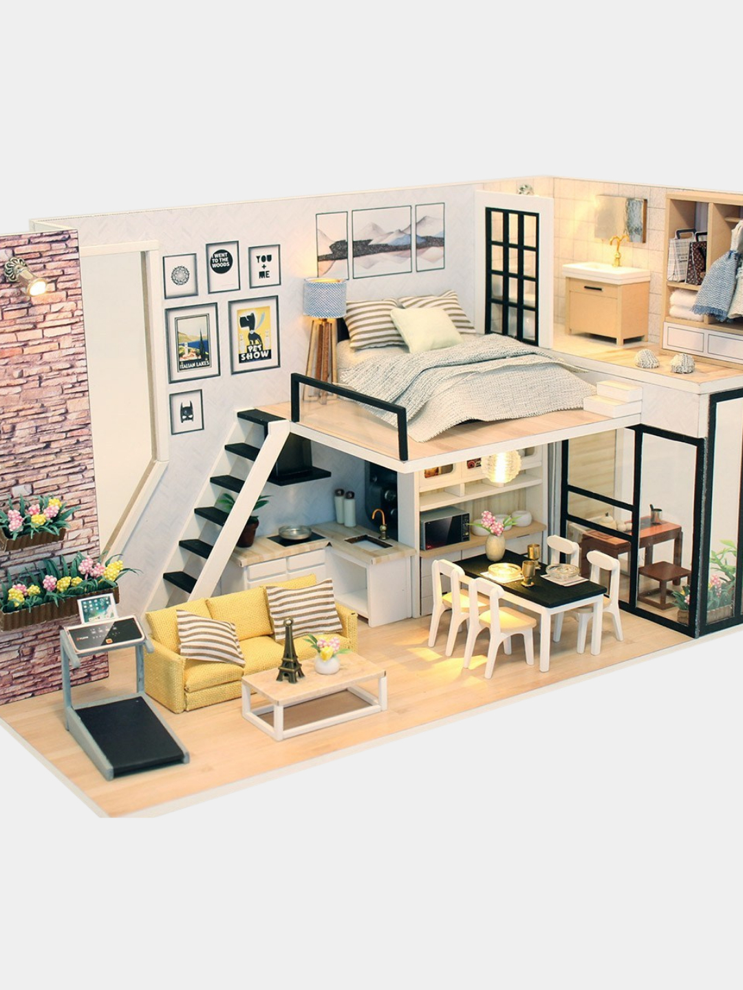 Интерьерный конструктор "Студия в стиле модерн" с подсветкой - это набор для создания удивительно детализированного кукольного интерьера в миниатюре. В студии есть светлая спальня, крошечный санузел, гардеробная, просторная гостиная с диванчиком и беговой дорожкой, уютная обеденная зона с современной бытовой техникой и стильной посудой и даже небольшая лаунж-зона. В наборе, состоящем из 236 элементов, вы найдёте все необходимое для творчества. Сборка мельчайших деталей уютного интерьера поможет развить усидчивость и аккуратность. Завершающим штрихом моделирования станет проводка светодиодной подсветки. Все наборы серии выполнены из качественных материалов и имеют красивую подарочную упаковку.