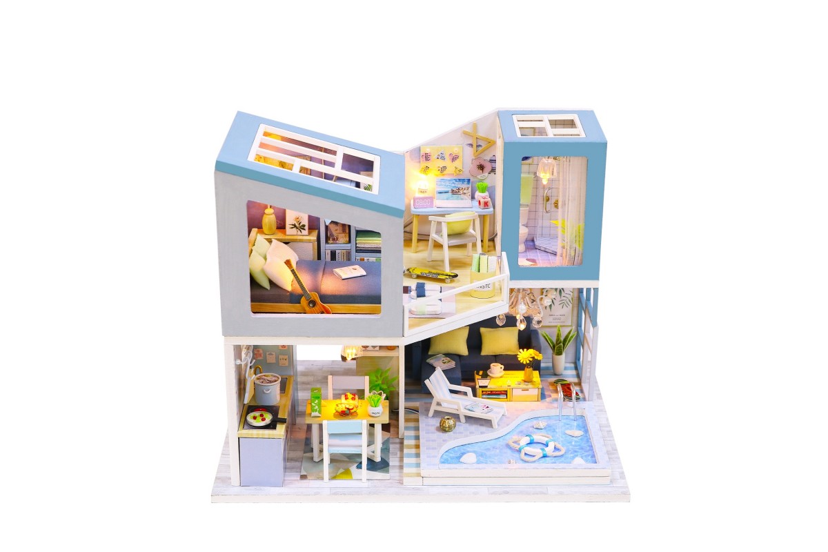 Сборная модель роскошного современного особняка с бассейном, выполненная в голубых тонах. Настоящая мечта!