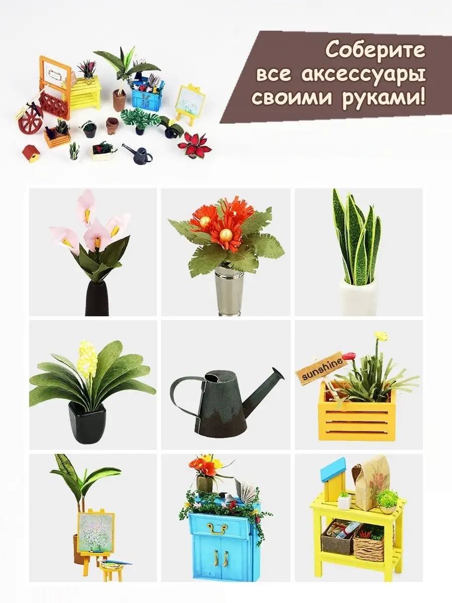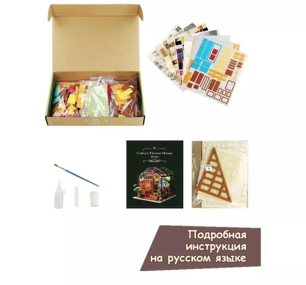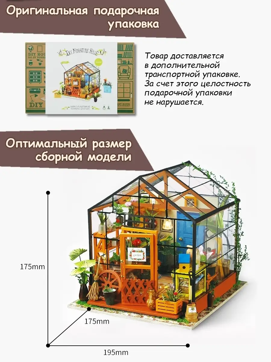 Румбокс – вариация массового увлечения, существовавшего много веков назад. Сегодня интерьерные конструкторы невероятно популярны в Европе и с недавних пор завоевывают любовь юных и взрослых россиян. В нашем магазине вы можете найти разные сборные модели для вашего творчества: Зимний сад, Цветочный рай и механический глобус. Румбокс (Roombox) Зимний сад — это сборная модель конструктор с подсветкой, который в мельчайших деталях повторяет дизайн цветочной оранжереи. Домик декоративный включает в себя миниатюрные деревянные предметы интерьера, мебель, растения и другие маленькие детали из натуральных материалов: дерева, бумаги, мягкой ткани, а также канцелярия: клей, кисточка, металлический пинцет, необходимые для сборки. Игровой комплект можно использовать в качестве ночника, благодаря светодиодному освещению - светильникам и лампам, и прозрачному каркасу, который не мешает насладиться результатом совместного творчества всей семьи. Сборная модель дома может использоваться как декор интерьера или как игрушка, для развивающих игр с детьми, мальчиками, а также девочками в куклы барби. Румбокс – альтернатива кукольному дому, благодаря которой осуществить заветную мечту совсем несложно. Декоративный дом сборная модель сочетает много важных функций, но его основная цель – развитие творческих способностей взрослого или ребенка, релаксация, возможность погрузиться в сказочный мир миниатюры, вернуться в прошлое, заглянуть в будущее. Аксессуары для домашнего комплекса разложены по пакетам и упакованы в красивую картонную коробку, поэтому развивающая игрушка DIY House подойдет в качестве подарка родным и близким, детям и взрослым по любому поводу и без него!