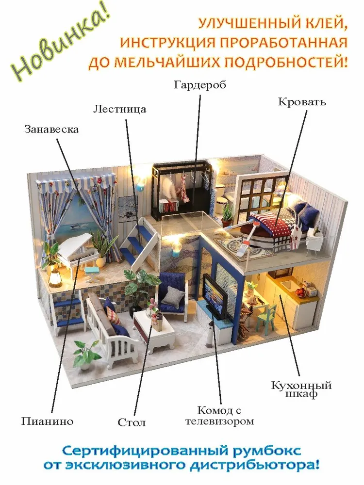 Румбокс. Интерьерный конструктор Mini House Hobby Day "Путешествие на море", PC2116 - Официальный и русифицированный румбокс от компании Hobby Day, которая подарила нам такой бестселлер, как Скандинавский лофт. Встречайте новый лофт "Путешествие на море", который расположился на берегу пляжа с белым песком. В лофте "Путешествие на море" есть все, что нужно для комфортной и спокойной жизни, а ночная подсветка из 6 ламп украсят ваш дом уютной и теплой летней атмосферой. Предлагаем вашему вниманию новинку от компании Hobby Day с инструкцией на русском языке, которая станет отличным подарком для людей любого возраста и пола! Проверяйте наличие логотипа Hobby Day на упаковке, остерегайтесь подделок!