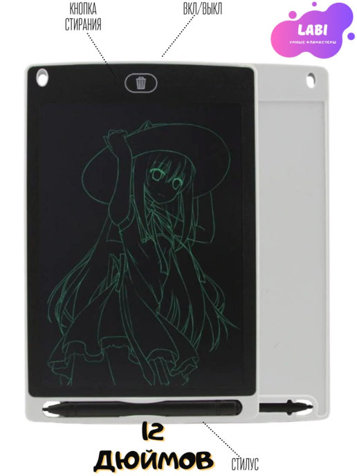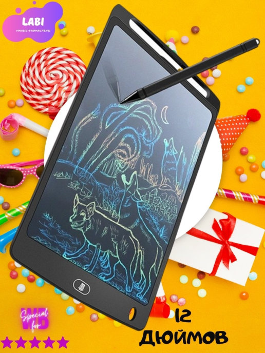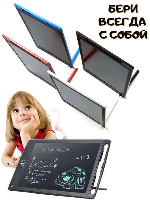 Электронный планшет для рисования и заметок LCD Writing Tablet позволит вам делать различные временные заметки, не расходуя постоянно листы бумаги. С планшетом вы сможете фиксировать важные данные во время телефонного разговора. А дети смогут рисовать на нем любые свои фантазии. Планшет выполнен из надежного, безопасного пластика и оснащен ярким жидкокристаллическим дисплеем с диагональю 12 дюймов. Экран и корпус устойчивы к падениям и царапинам, благодаря чему, планшет можно не опасаясь доверять ребенку, не переживая за сохранность устройства. В комплекте к планшету идет эргономичный стилус. Область применения планшета очень широка. Он может пригодится вам во множестве ситуаций помимо развлечений и работы.