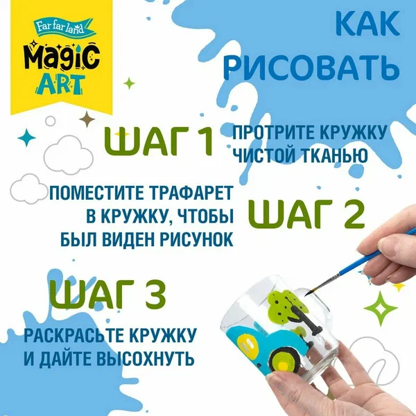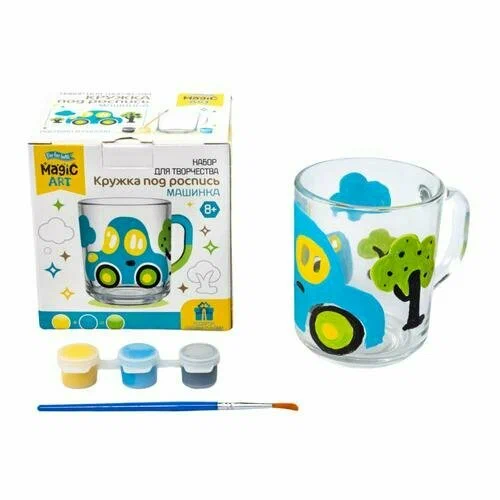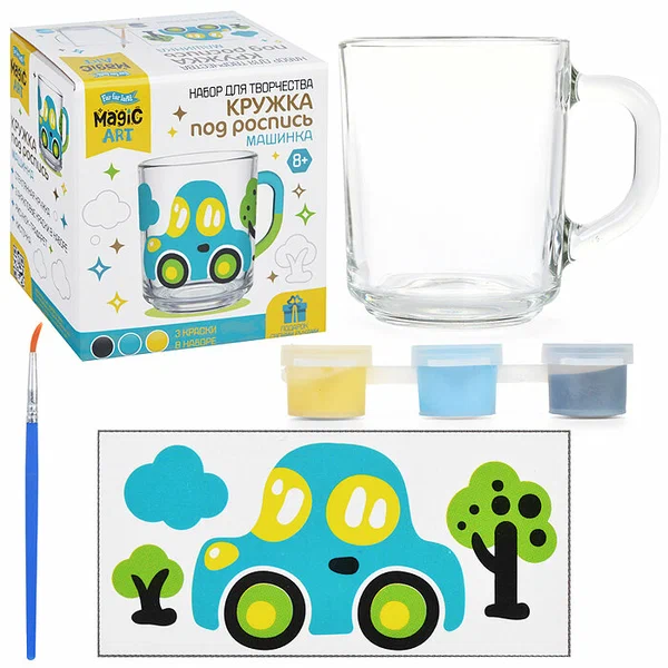 стеклянная кружка 1 шт (высота 9 см, диаметр 7 см, 200 мл), акриловые краски 3 шт (черная, голубая, желтая), рисунок-трафарет 1 шт (16 х 7,5 см), кисточка 1 шт (13,5 см). Материалы: бумага, стекло. |