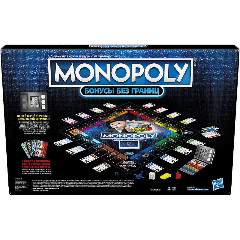 Настольная игра Монополия для настоящих стратегов. У каждого игрока есть банковская карта, которая приносит ему различные награды. Игроки могут перелетать к любой собственности на поле и вынуждать других игроков продавать свои владения. В этой версии “Монополии” нет бумажных денег - только банковские карточки и терминалы. Покупайте недвижимость, собирайте арендную плату и получайте вознаграждение! Выиграет тот, кто заработает самое большое количество бонусов!