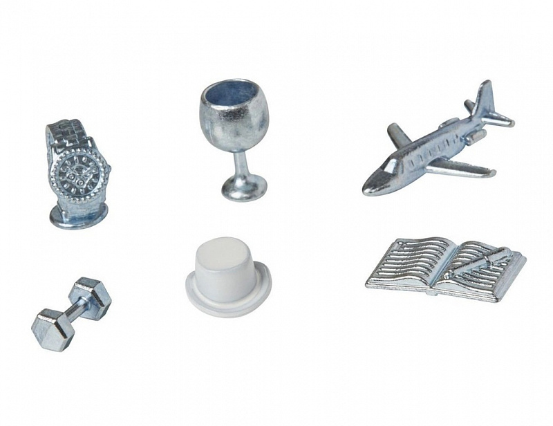 - Игроки получают жетоны, которые выполнены весьма оригинально в виде предметов: записная книжка с ручкой, самолет, бокал, часы, гантель или белая шляпа Мисс Монополии.