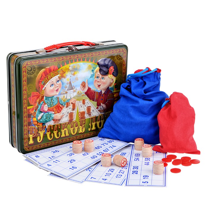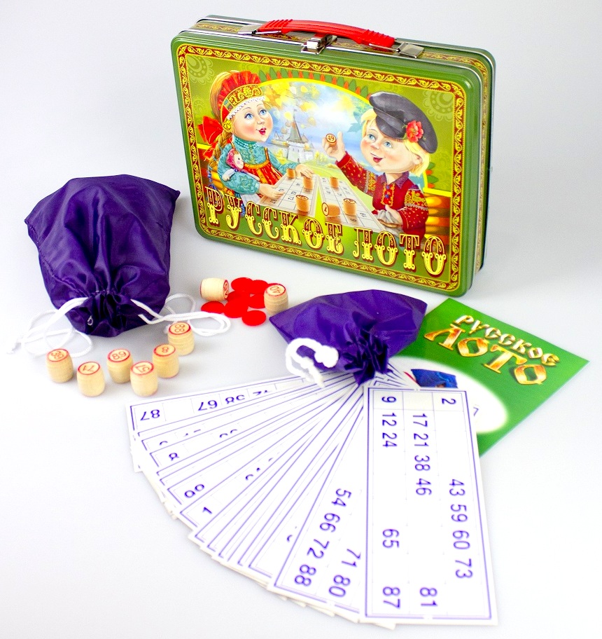 Яркое, красиво оформленное русское лото в жестяном чемоданчике «Посиделки» привлекает внимание и является идеальным вариантом для подарка. Внутреннее содержание этого чемоданчика также не разочарует Вас. Красивые, гладкие, с легко читаемыми цифрами, бочонки приятно доставать из полотняного мешочка и держать в руке. Мы позаботились о такой мелочи, как «закрывашки» - 150 штук вполне достаточно. Постарались исправить все то, что по нашему мнению может испортить удовольствие от игры в русское лото.