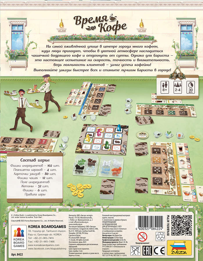 На самой оживлённой улице в центре города много кофеен, куда люди приходят, чтобы в уютной атмосфере насладиться чашечкой бодрящего кофе и отдохнуть от суеты. Однако для бариста – это настоящее испытание на скорость, точность и внимательность, ведь лояльность клиентов – залог успеха кофейни! Выполняйте заказы быстрее всех и станьте лучшим бариста в городе! Собирая ингредиенты, игроки будут готовить напитки, улучшать свои навыки и стараться вовремя выполнять заказы, чтобы не получить штрафных очков. Тот, кто к концу игры наберёт наибольшее количество очков, победит!