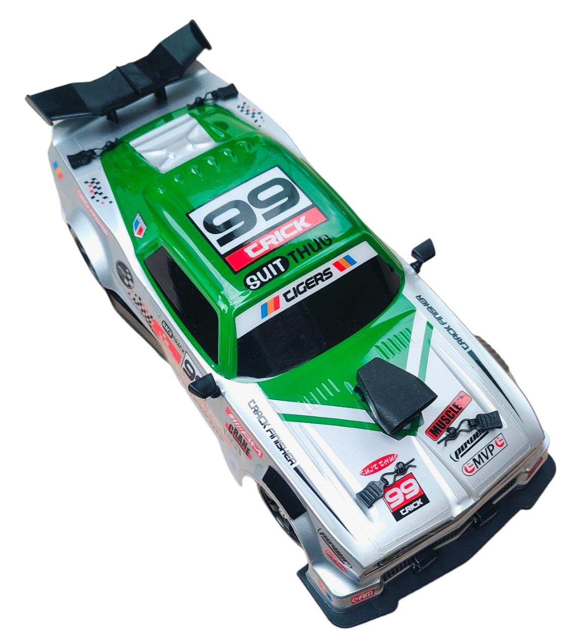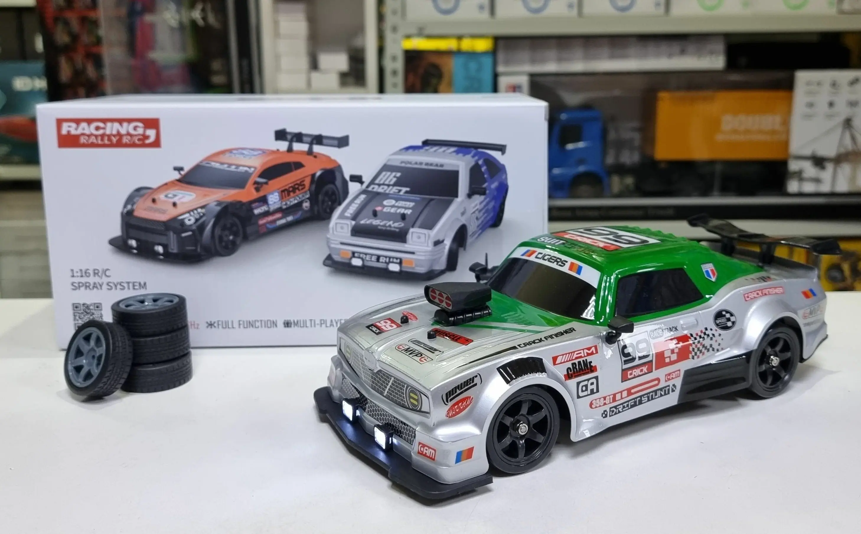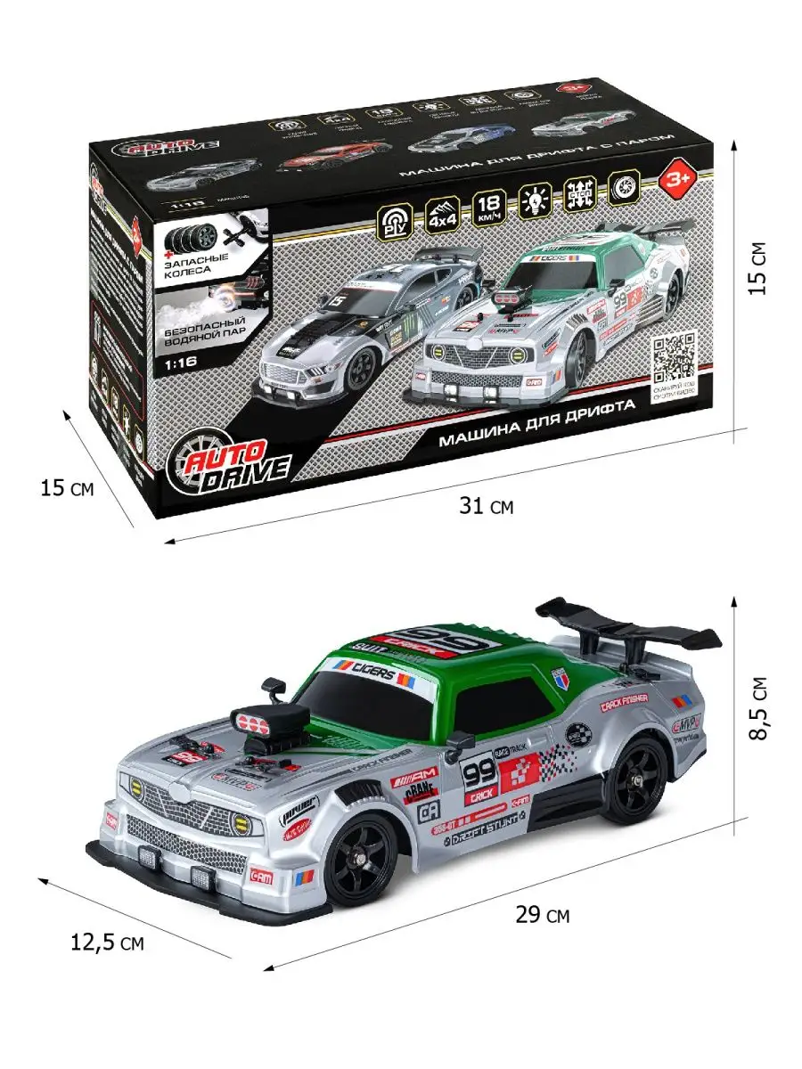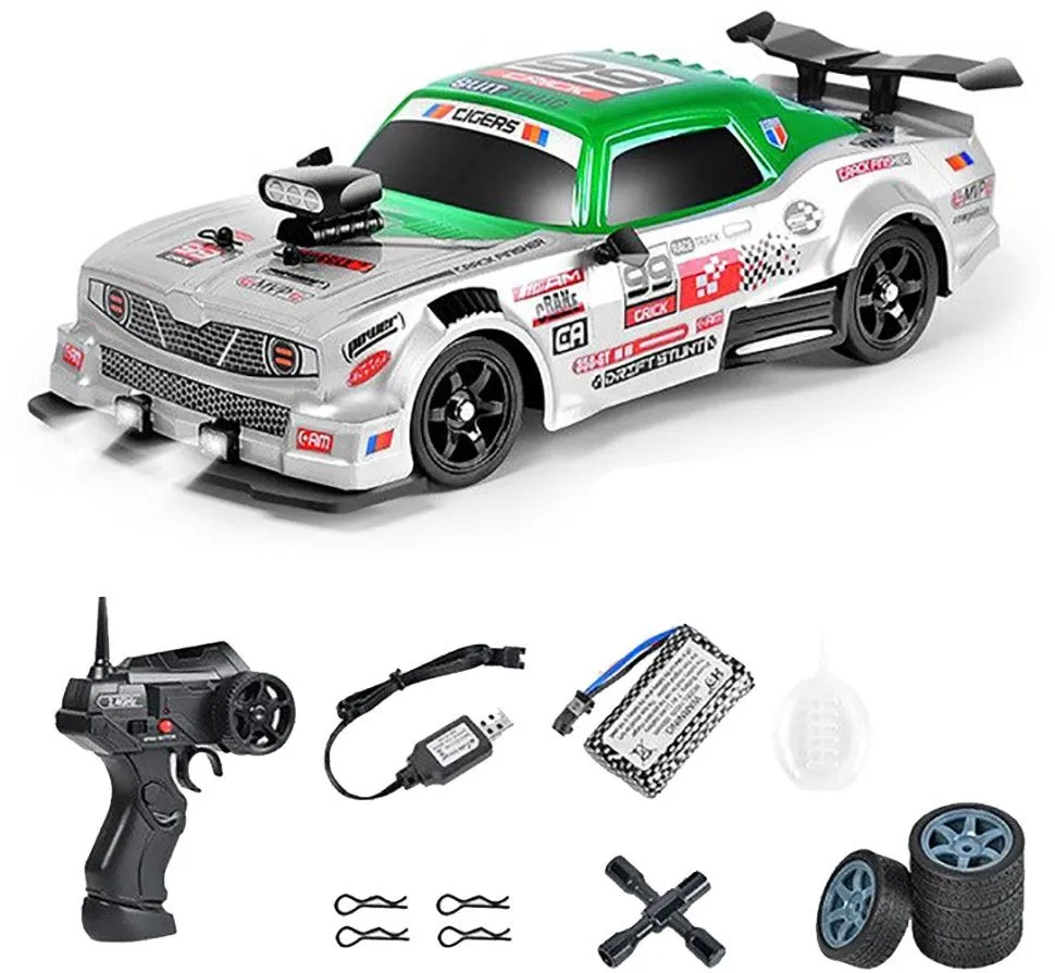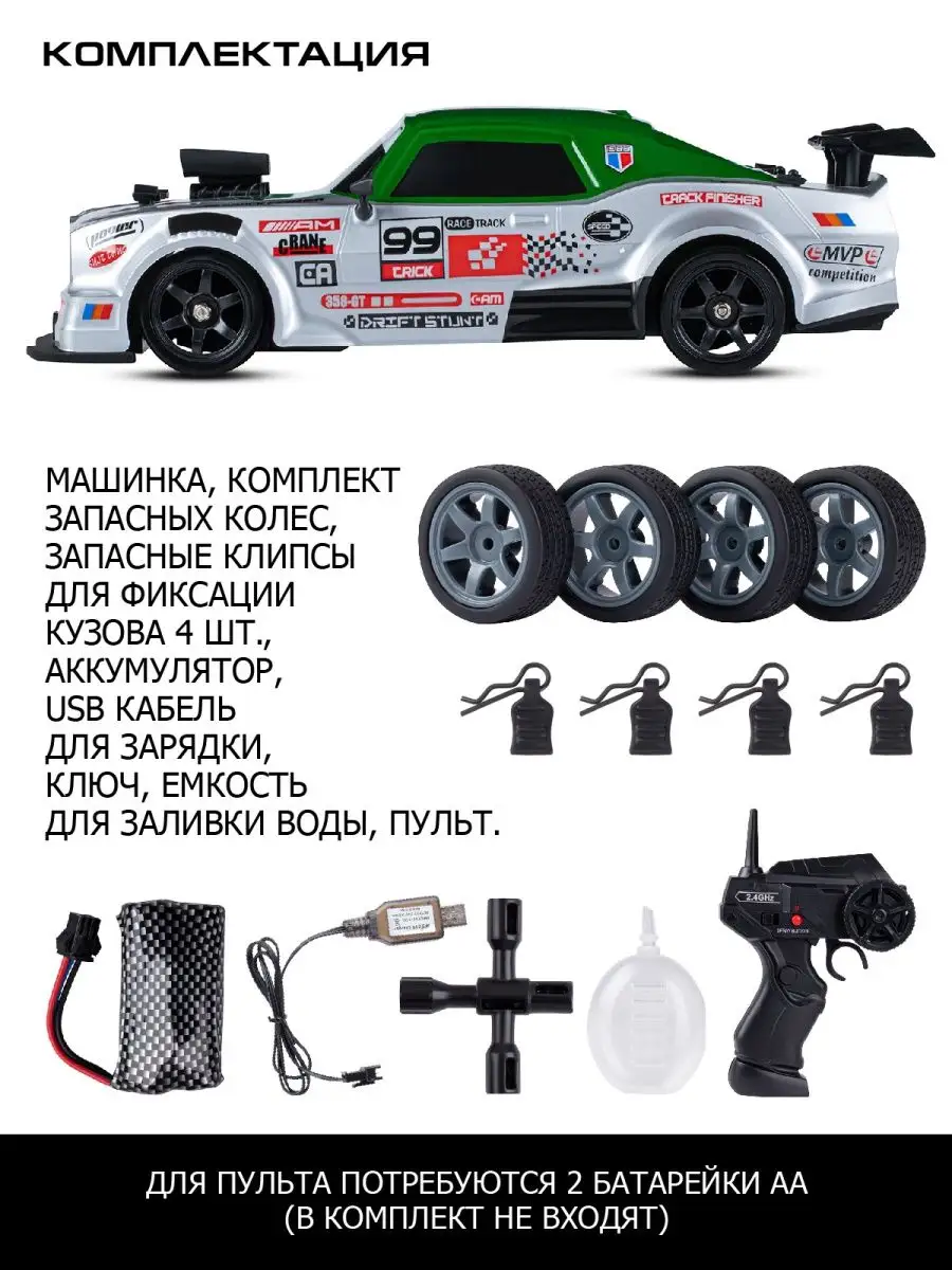 машинка для дрифта, пульт управления, ёмкость для воды, 2 комплекта колёс, ключ, аккумулятор, зарядное стройство |
