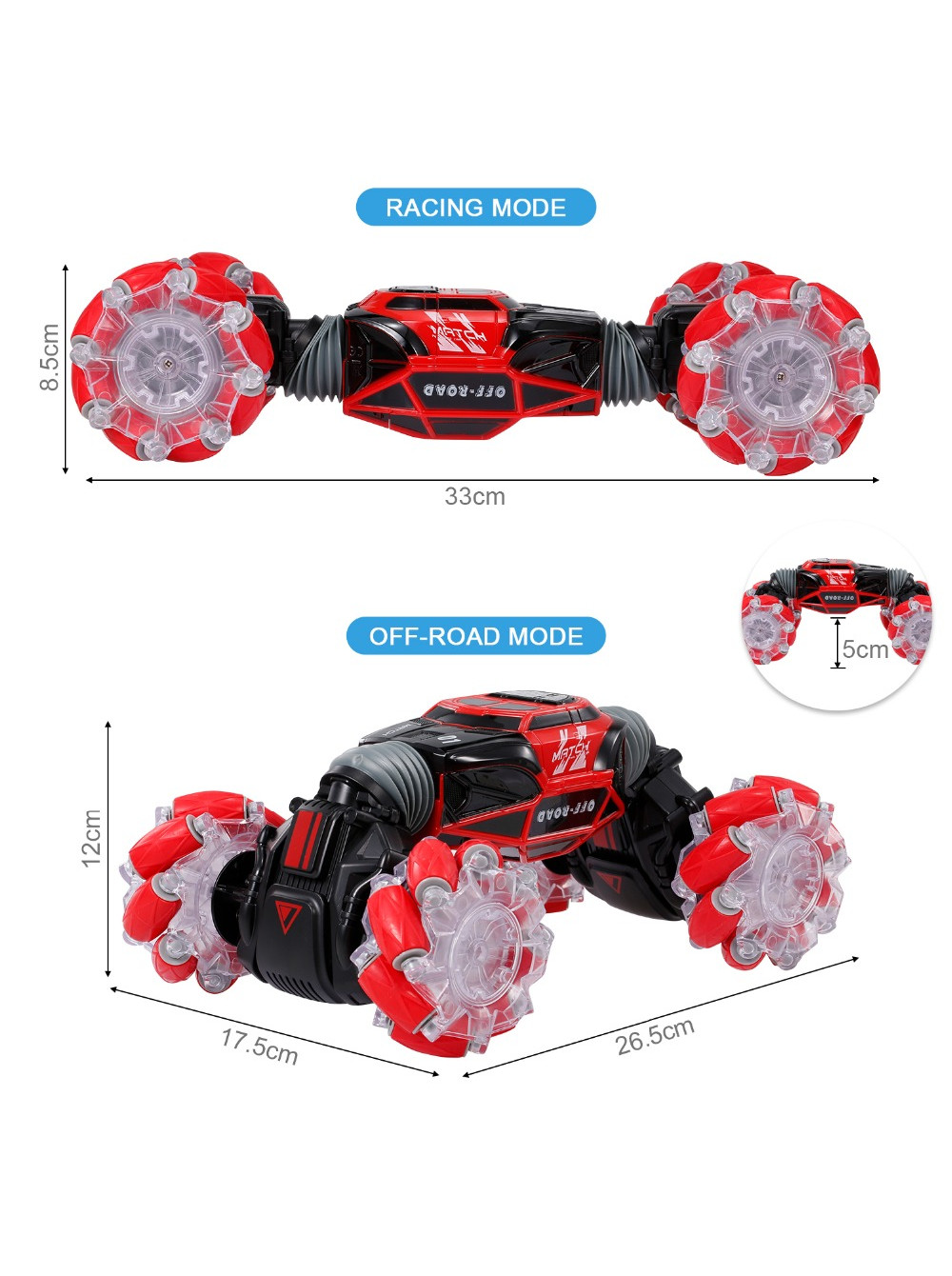 - Модель обладает функцией трансформации. Если машина перевернётся на крышу, нажмите на соответствующую кнопку и она снова окажется на колесах. Также вы сможете регулировать высоту подвески игрушки, что позволит ей передвигаться по разным поверхностям и взбираться на небольшие преграды.