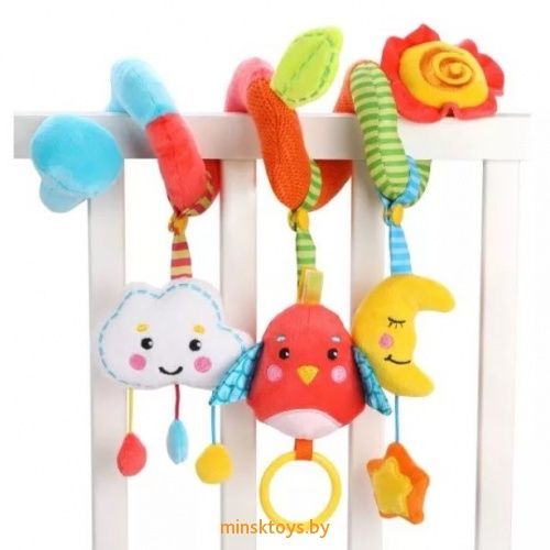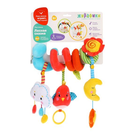 "Лесная сказка" - это игрушка-растяжка, которую можно подвесить на бортик детской кроватки или автокресло. Она растягивается, словно гармошка! К игрушке прикреплены развивающие элементы: птичка-пищалка с шуршащими крылышками, погремушки в виде облачка и месяца. Их можно снять с растяжки и дать малышу поиграть с ними отдельно.