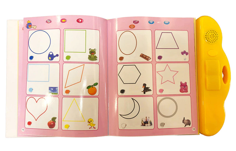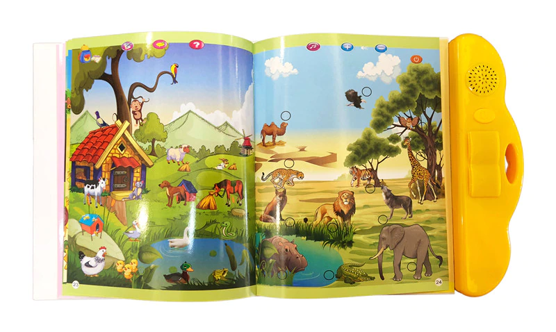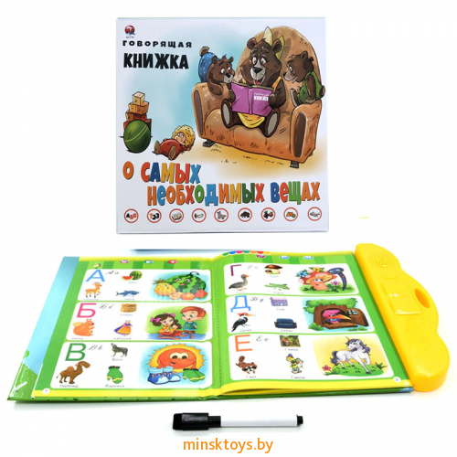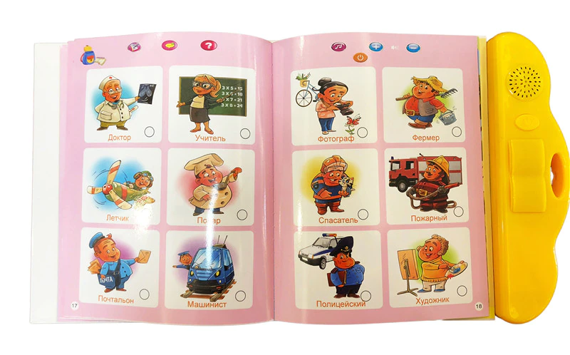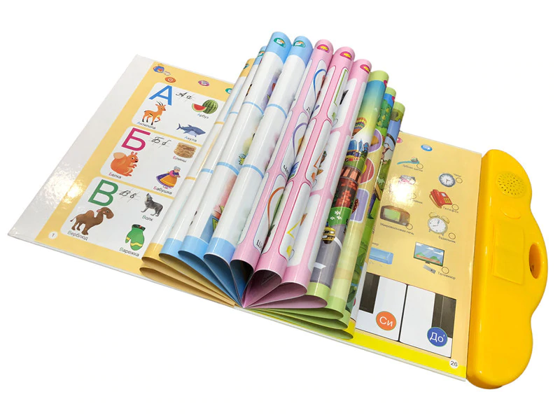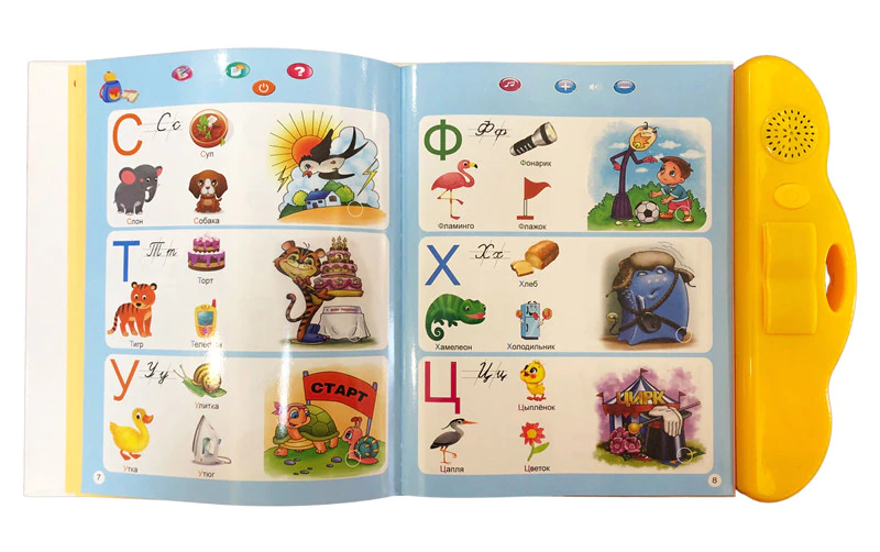Развивающая игрушка "Говорящая книжка". Книжечка поможет в изучении букв, слов, стихов, цветов, форм, фигур, видов транспорта, овощей и фруктов, животных, предметов и сказок. Странички функциональные - для начала игры нужно нажать на кнопку включения сначала на пластиковой панели, а затем сверху странички (нажимать каждый раз после переворота странички). Есть функция проверки выученного. Озвучено на русском языке.