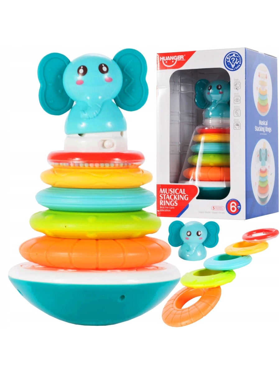 Пирамидальная башня имеет обруч для штабелирования. На вершине башни находится фигурка слона, уши которой сделаны из резины и могут использоваться как прорезыватель при прорезывании зубов. Верхний обод также является храповым механизмом, и обода можно устанавливать в любом порядке. Все это помещено на закругленное основание, которое откидывается вбок. Многие цвета и формы стимулируют зрительные стимулы ребенка, правильно развивая когнитивные двигательные навыки. При надевании обручей из игрушки доносятся разные звуки. При надевании обручей из игрушки исходят различные звуки, а после нажатия кнопки под питомцем раздаются короткие мелодии и звуки животных. Размеры продукта: 14,0 x 14,0 x 23,8 см. Размеры упаковки: 16,0 x 15,5 x 27 см.