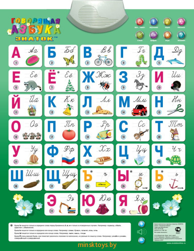 Новая версия популярнейшего звукового плаката «Говорящая Азбука» предназначен для детей и взрослых, начинающих изучать русский язык. Дополнения в плакат были внесены в соответствии с пожеланиями родителей и педагогов. В процессе пользования плакатом можно познакомиться не только с «именем» буквы, но и её звуком и порядковым номером, услышать стихи и весёлую песенку про алфавит. Имеет 8 режимов работы.