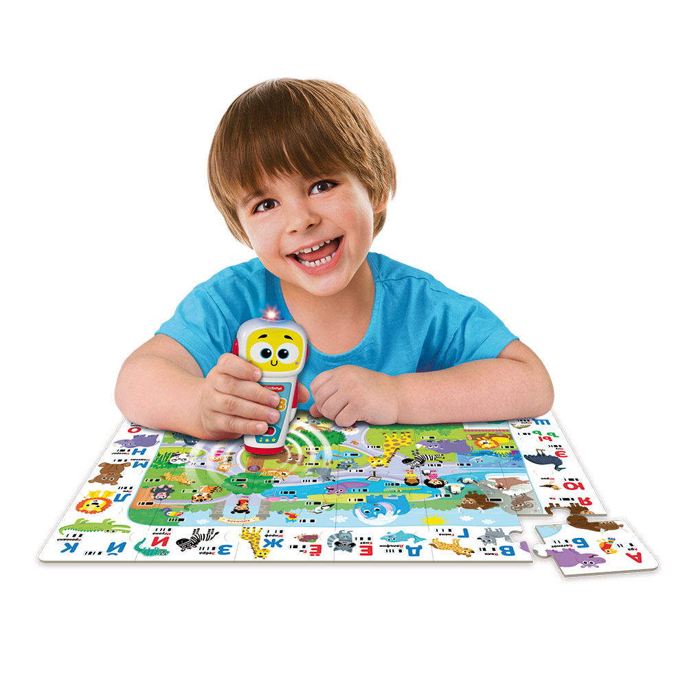 Перед началом игры ребенку нужно самостоятельно собрать большое игровое поле-пазл. Затем можно учить буквы и знакомиться с животными зоопарка вместе с роботом Робби. Для этого нужно просто ставить робота на штрихкоды возле букв и картинок – он будет говорить и петь. После обучения можно проверить знания – робот Робби предложит множество умных вопросов, оригинальных загадок, веселых заданий. В такой игровой форме узнавать новое гораздо интереснее!