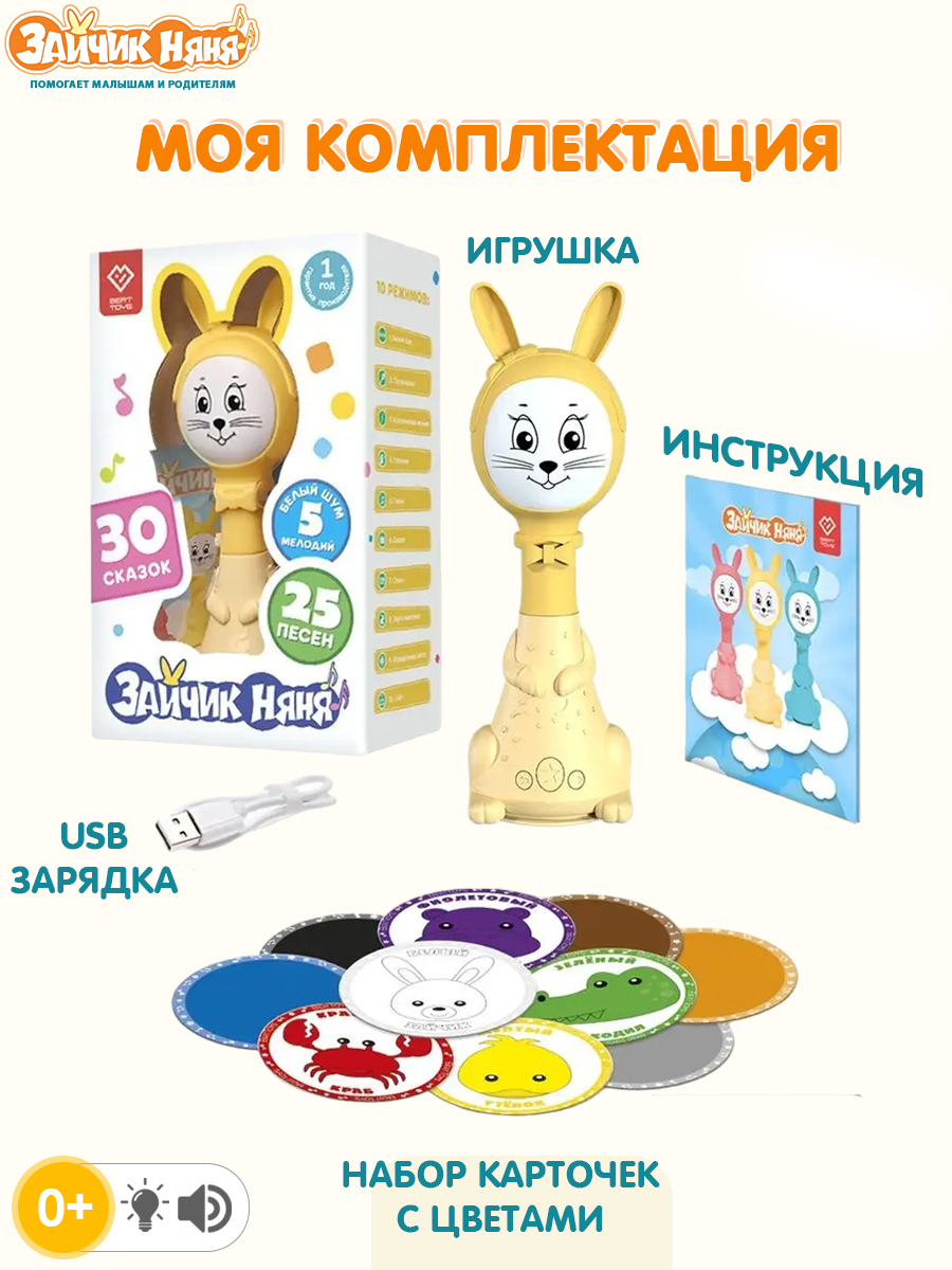 погремушка, зарядное устройство, инструкция, карточки с цветами |