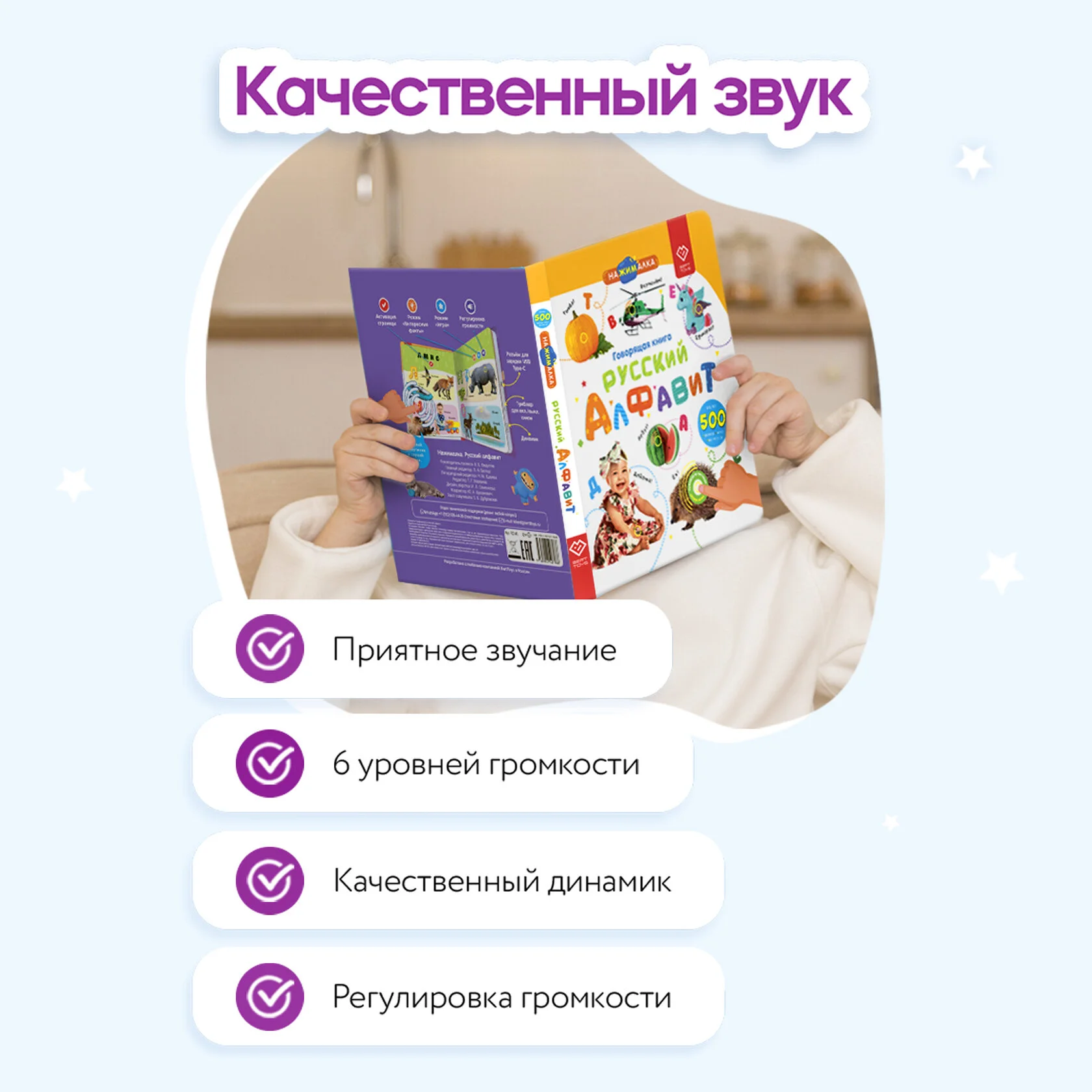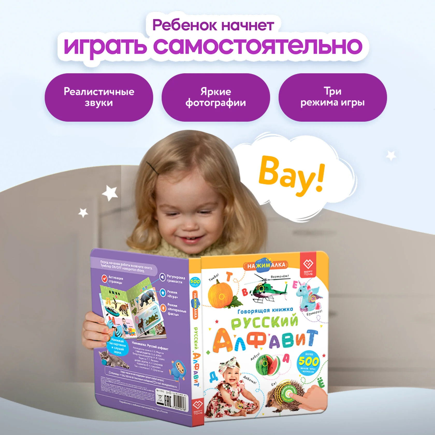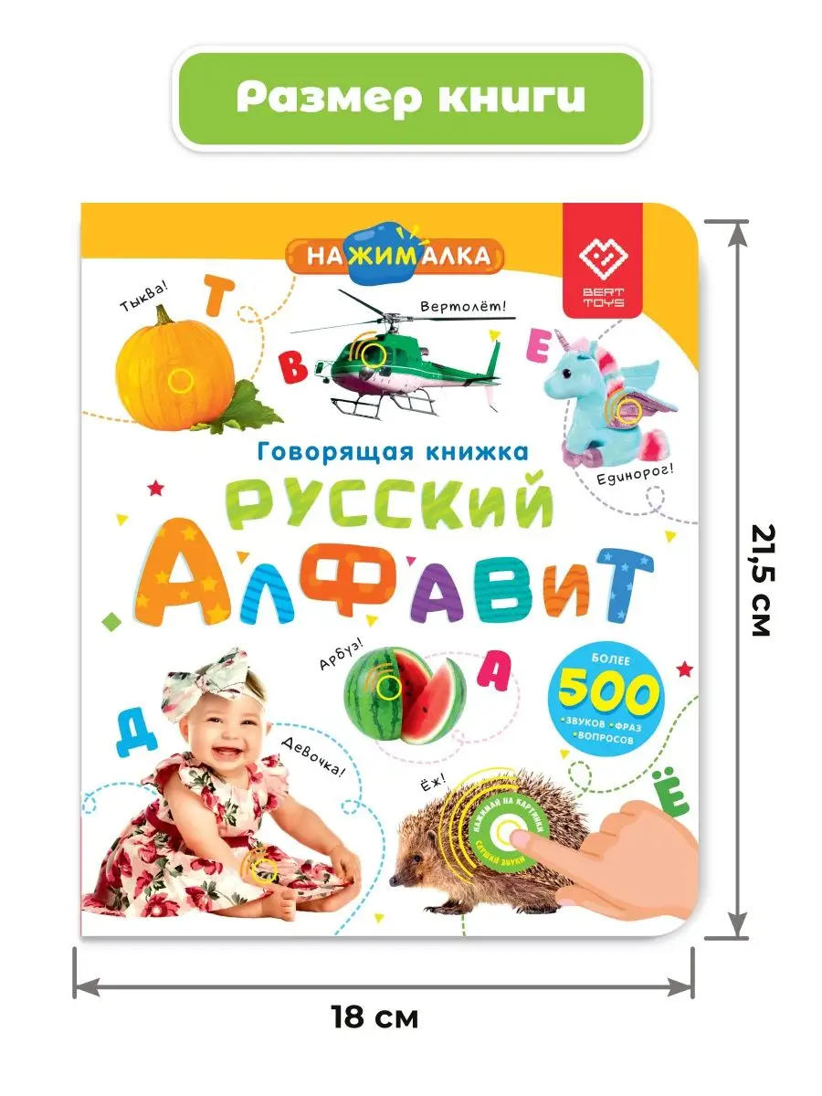Говорящая книжка для детей «Русский алфавит» от BertToys – это полезный и развивающий подарок на праздник, который понравится и мальчикам, и девочкам. Заменив гаджеты и отвлекая от мультиков, она поможет вашему ребенку учиться и играть с удовольствием.