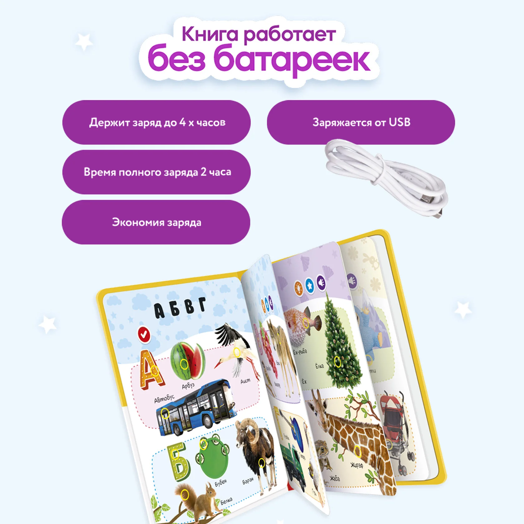 Книжка имеет прочный картонный переплет, который подходит для частого использования, а плотная бумага не мнется и не рвется. Благодаря компактным размерам, ее удобно взять с собой в дорогу или в детский сад. Не требуя батареек, она работает от розетки, что позволяет избежать проблем с постоянной заменой батареек.