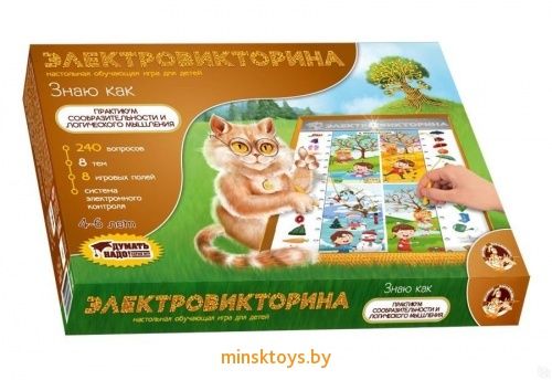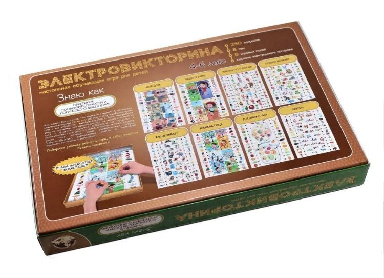 Что может быть лучше, чем знания для жизни?! С обучающей электровикториной «Знаю как» ребенок с ходу определит время года и его атрибуты; наведёт порядок в доме, распределив вещи по комнатам; сам приготовит суп из овощей и компот из ягод и фруктов; научится собираться на прогулку в соответствии с ситуацией: в поход, в театр, на пляж в школу. Более того малыша ждут увлекательные ребусы, «загадки-небылицы», разноцветные мозаики и настоящий тренажёр по чтению с картинками.