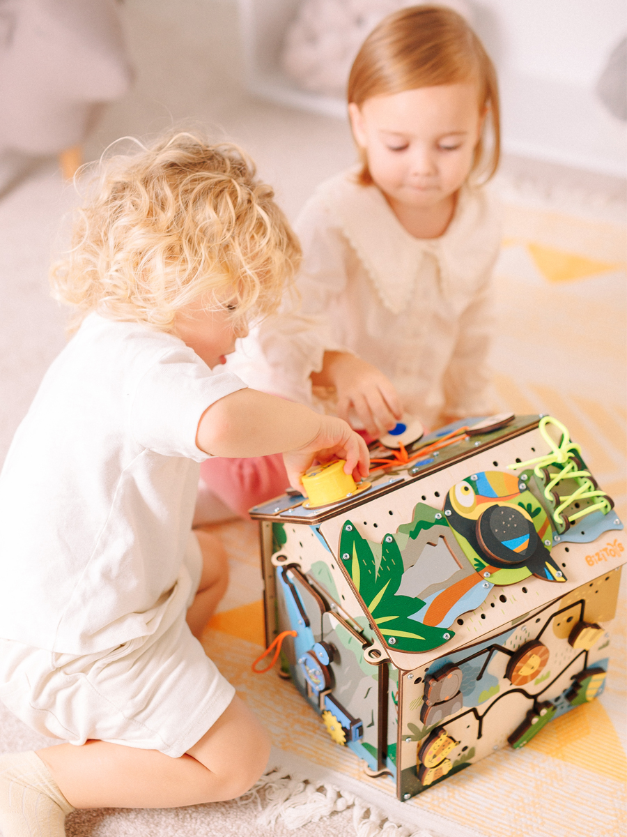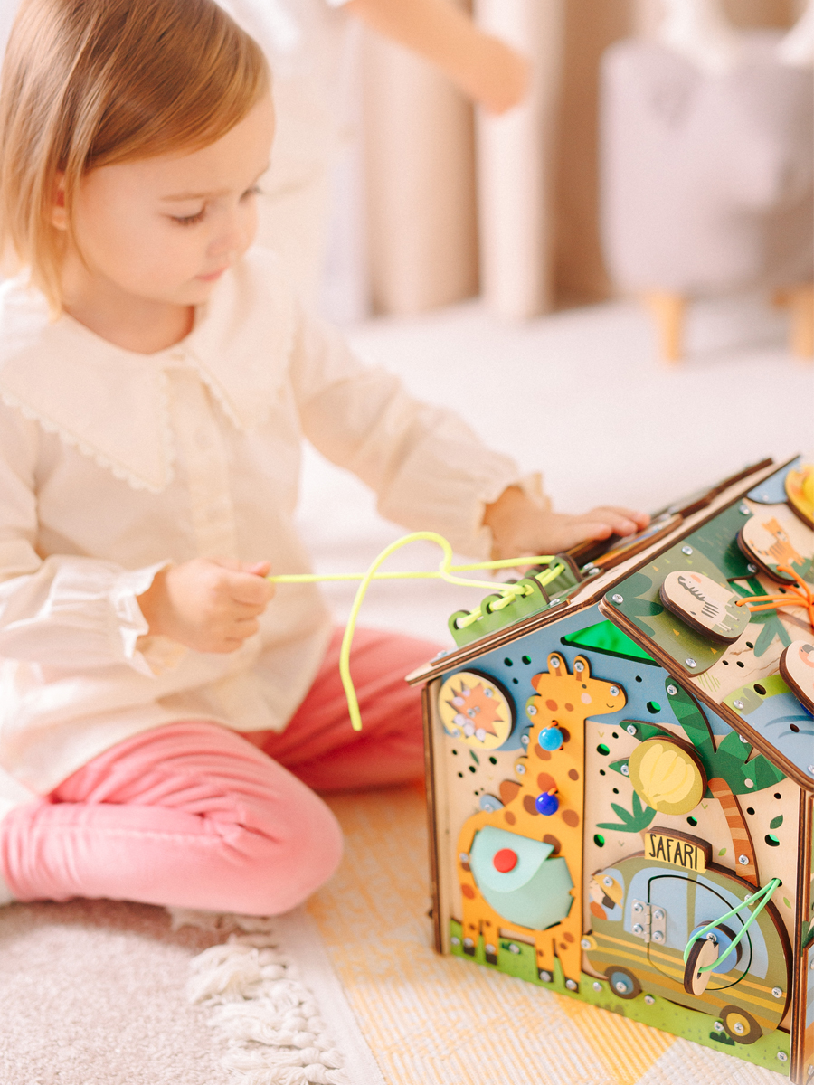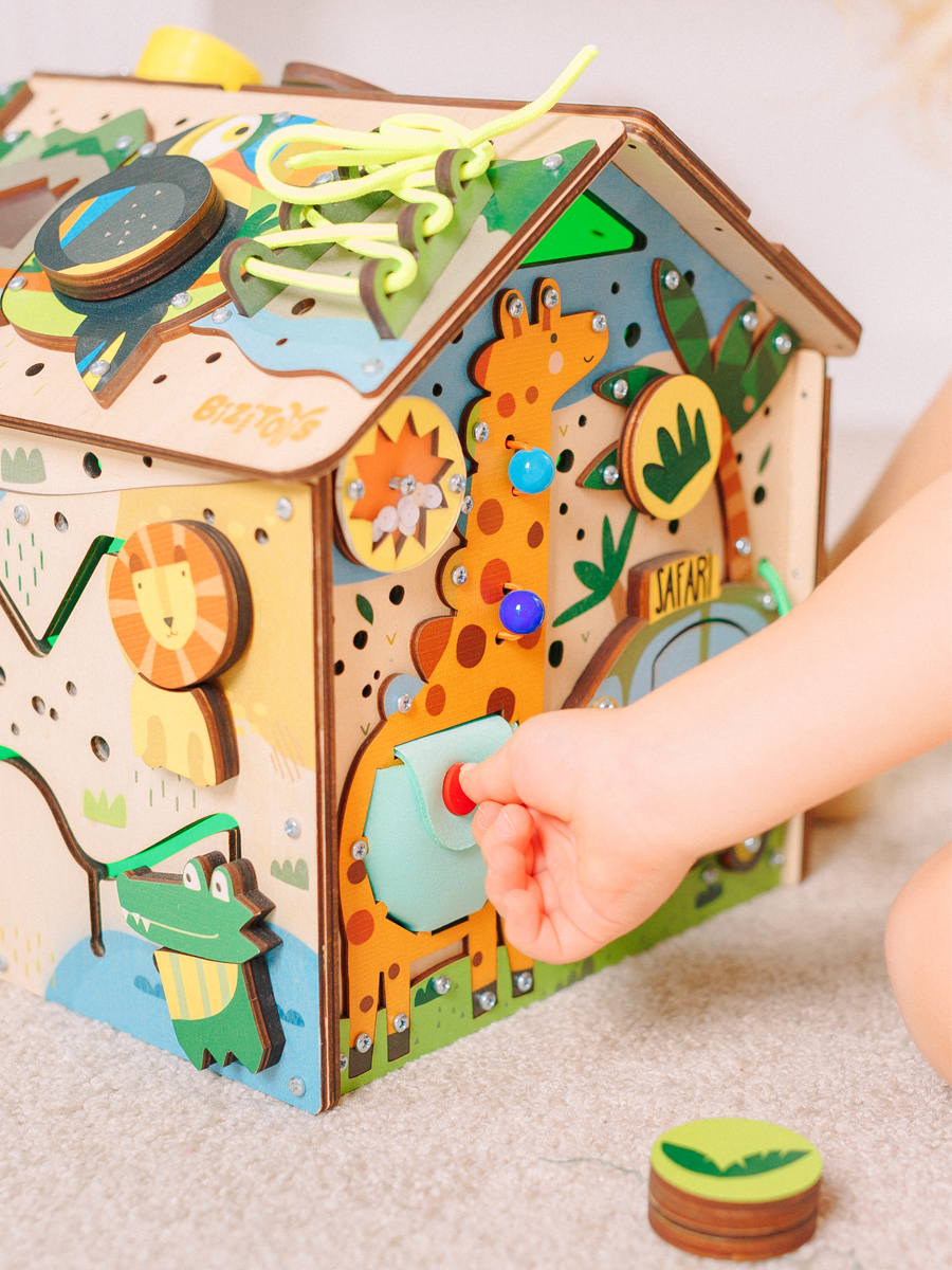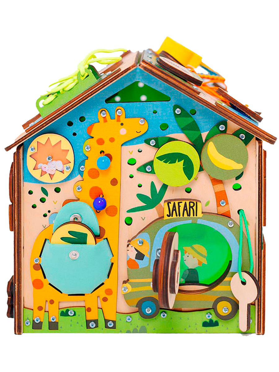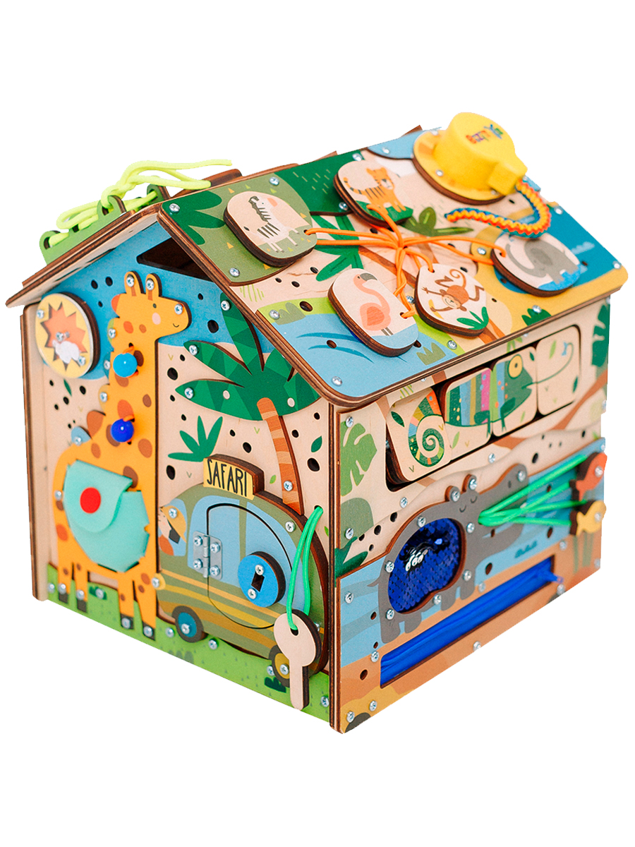 Крыша 2. Выключатель Выключатель в виде тукана включает подсветку внутри домика. Рядом — зеркальце из небьющейся пленки и шнуровка, которая учит завязывать шнурки. Батарейки типа ААА надежно спрятаны, инструкция по замене прилагается. Бизидом мини «Сафари» – это не просто игрушка, а настоящий бизикуб для малышей, который станет любимым развивающим центром для вашего ребенка!