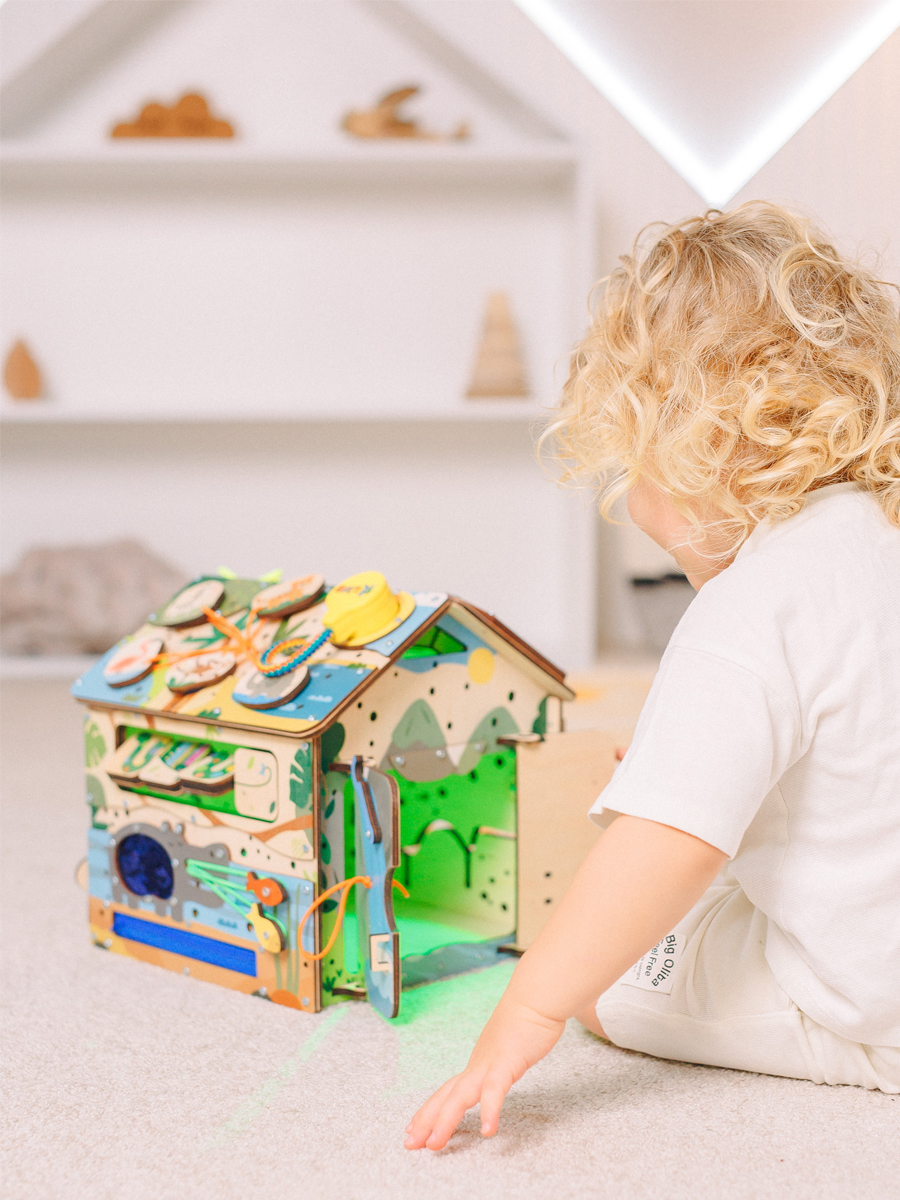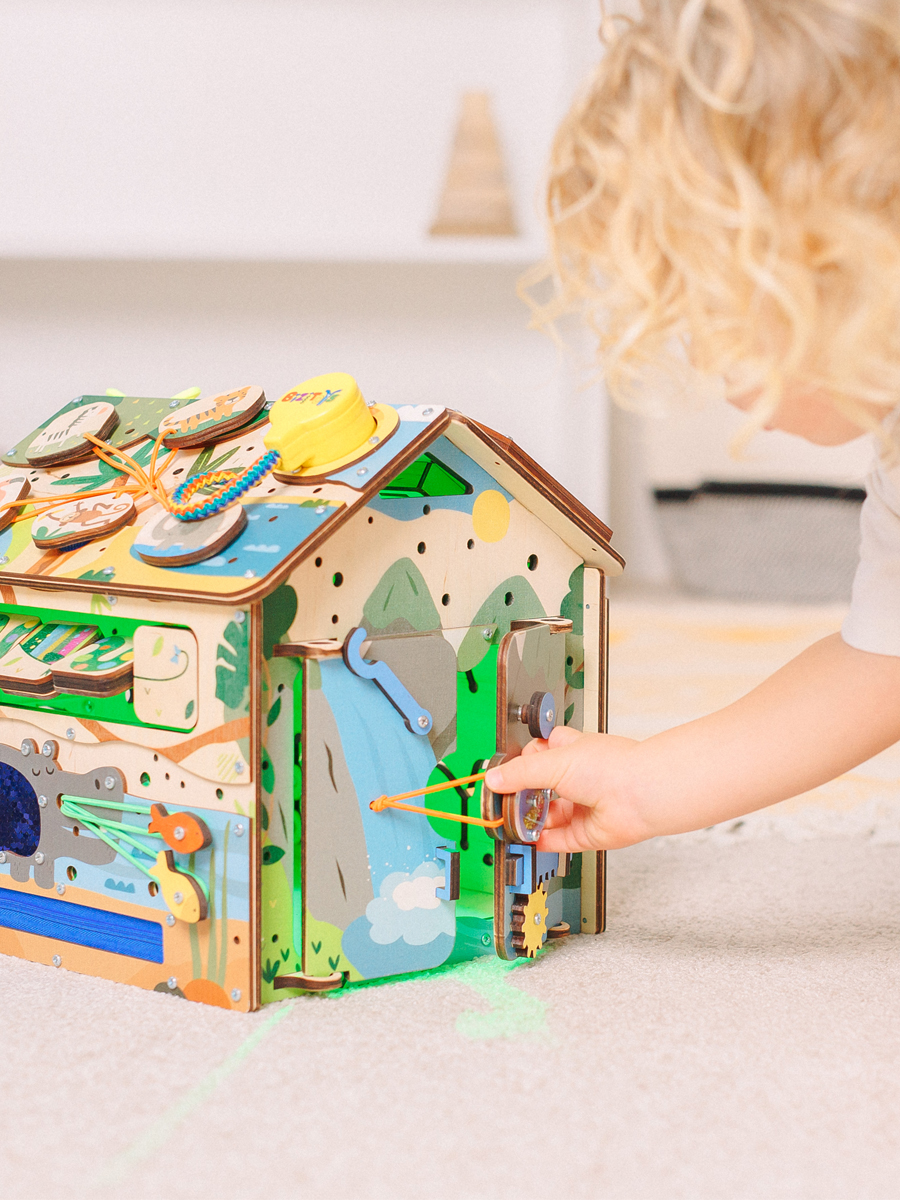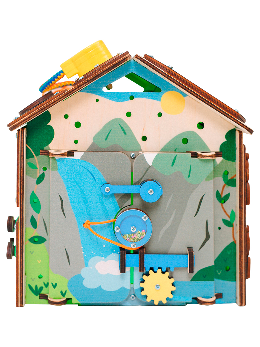 Сторона 1. Дверки Маленькие дверки ведут внутрь домика, где можно спрятать игрушки. Они закрываются на несколько замочков: сверху — деревянный крючок, снизу — шестеренка, которую нужно покрутить, чтобы открыть. Внутри круглого элемента пересыпаются яркие бусинки.