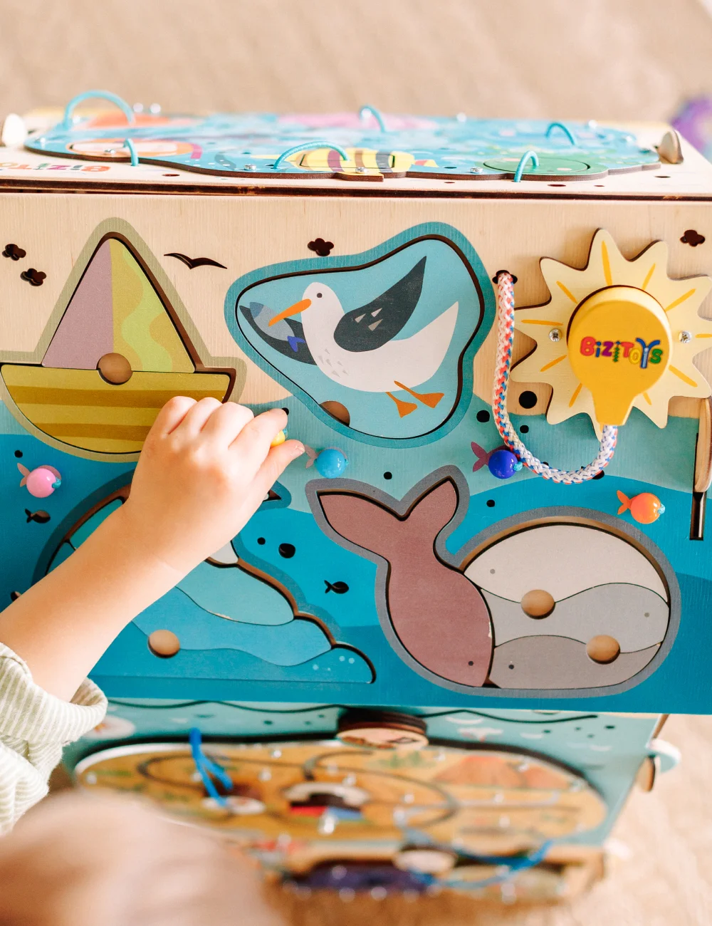 ИГРА: На круглом элементе нарисованы рыбацкие сети. С обратной стороны закреплен магнит. При вращении шестерен опускается веревочка и “сети”. Снизу домика на магнитиках плавают рыбки. Магнитами они скрепляются с “сетями”, а значит, можно поднимать “улов наверх. Малыш может представить себя рыбаком в открытом море