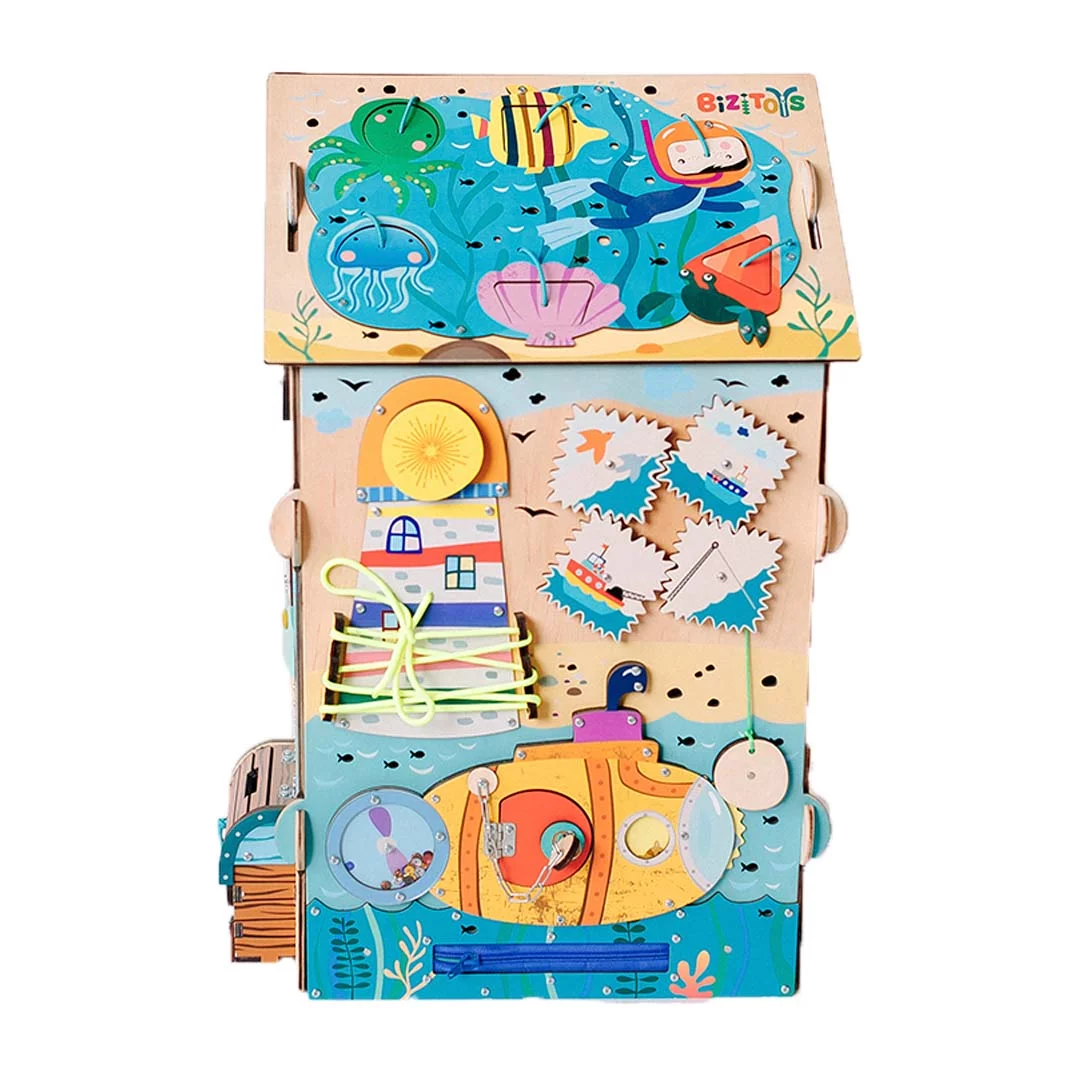 Открыв дверки, малыш может залезть внутрь и спрятаться в бизидомике. Края арки тщательно отшлифованы, поэтому малыш не пораниться.