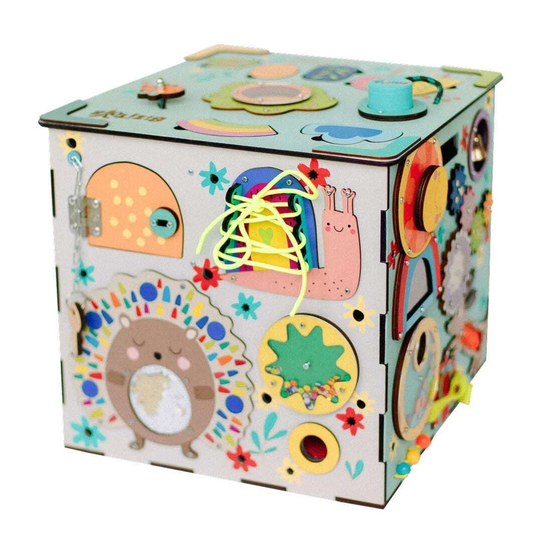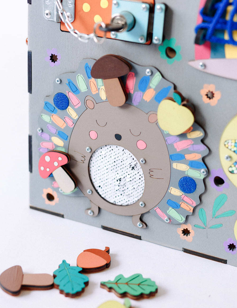 Дверка с ключиком, за которой скрывается настоящий сюрприз — открыв ее, в отверстие нужно забросить шарик, который выпрыгнет снизу! Улитка со шнуровкой, а ежик любит, чтобы его гладили по животики, в котором спрятана ткань из пайеток! Также на иголках ежик носит листики, грибочки и яблочки — веселой открепи и прикрепи их ежику! Яркая шестерня быстро умеет крутиться!