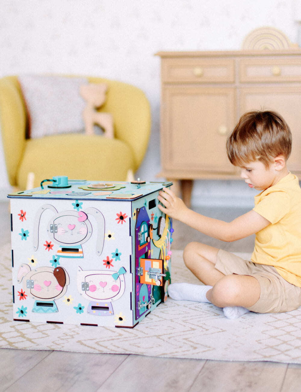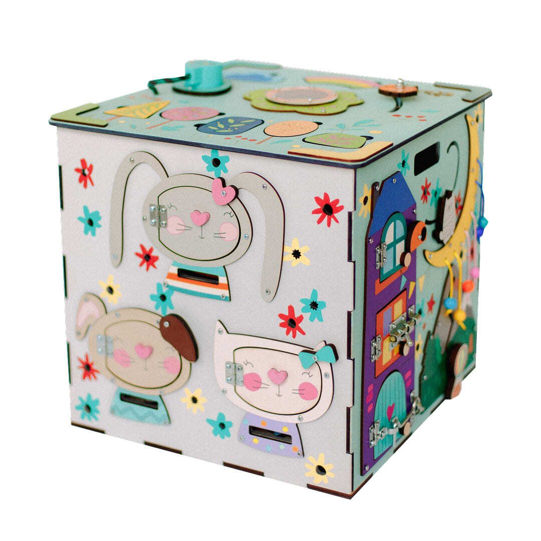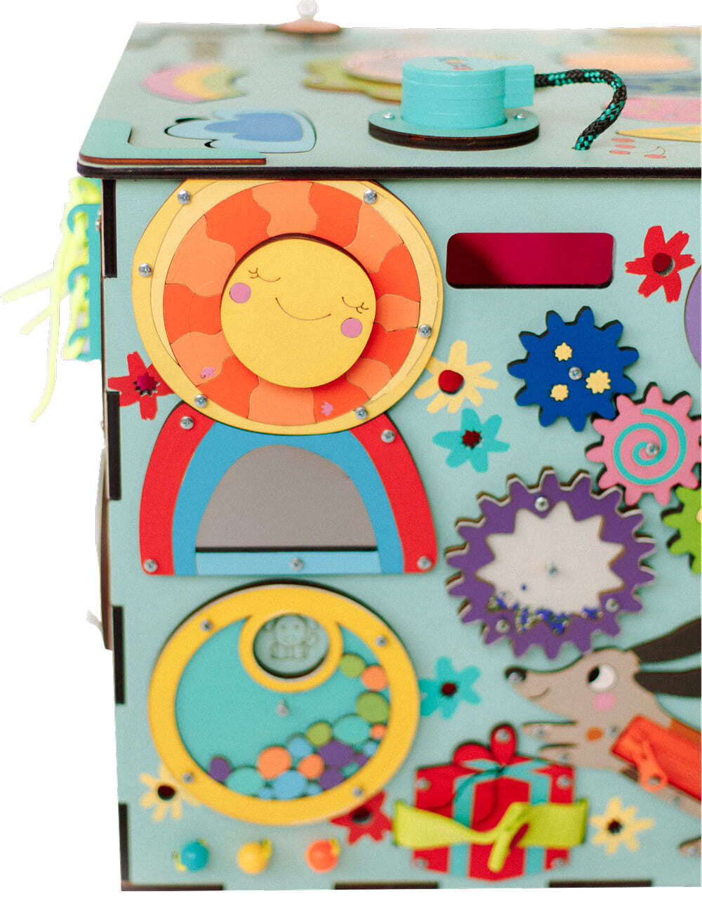 Нажав на выключатель, весь кубик засияет, что приведет вашего ребенка в восторг! данная функция может служить ночником в темное время суток! импровизированная розетка! Веселые шестерни, покрутив за одну все вместе начинают крутиться! Колокольчик! Шестерня с яркими камешками прячет за собой милых зверюшек! Длинная такса с молнией несет подарок и его нужно быстро научиться открывать и закрывать на кнопочку!