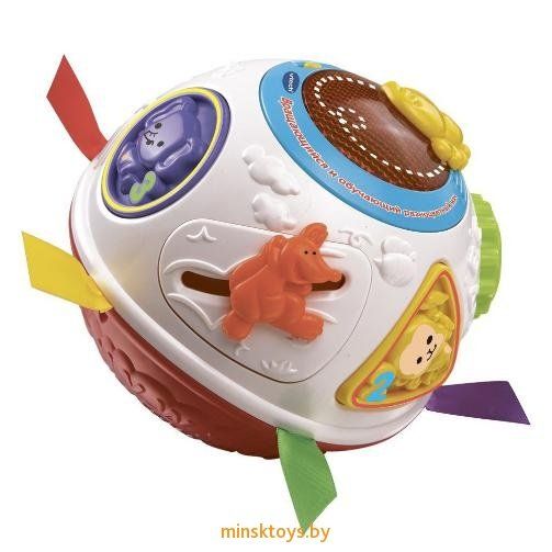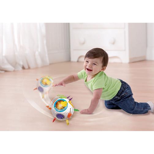 Полный забавных функций, позволяющий нажимать, катать и вращать. Вращающийся и обучающий, разноцветный мяч дает малышу представление о различных фигурах, числах, знакомит с животными и звуками. Оснащенный сенсором, мяч двигается, реагируя на радостный смех ребенка и воспроизводя более 50 различных мелодий, песен, звуков и фраз.