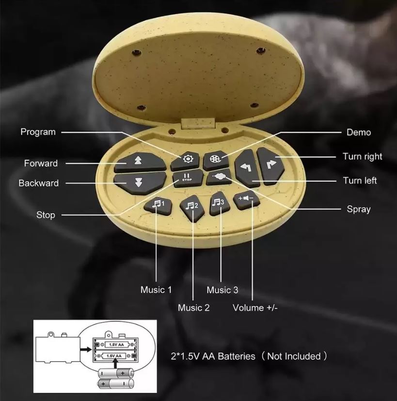 Управление осуществляется с дистанционного пульта управления. Для получения "эффекта пара" из пасти необходимо предварительно залить воду в специальное отверстие в голове динозавра, прикрытое крышечкой.