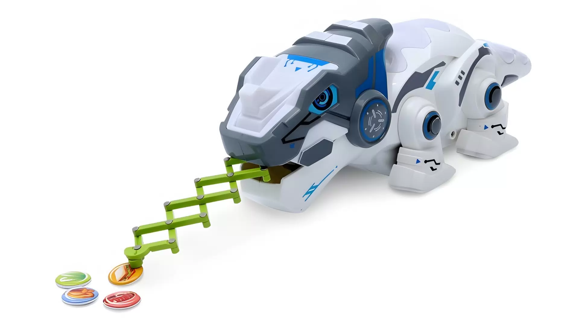 Движения динозавра хамелеона полностью контролируются с пульта дистанционного управления. Стики отвечают за движение и поворот, а обычные кнопки за ловлю еды с помощью языка (игрушка хватает языком магнитных насекомых) и дополнительные функции. Очень функциональная и интересная игрушка, идеально подойдет детям для знакомства с радиоуправляемыми игрушками.