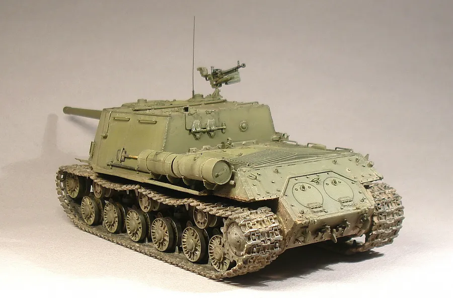 Самоходная артиллерийская установка ИСУ-122 создана осенью 1943 года на базе тяжёлого танка ИС. На этих машинах устанавливались пушки А-19 калибром 122 мм с начальной скоростью 25-кг снаряда 781 м/с, который пробивал с расстояния 1 км 145-мм броню.