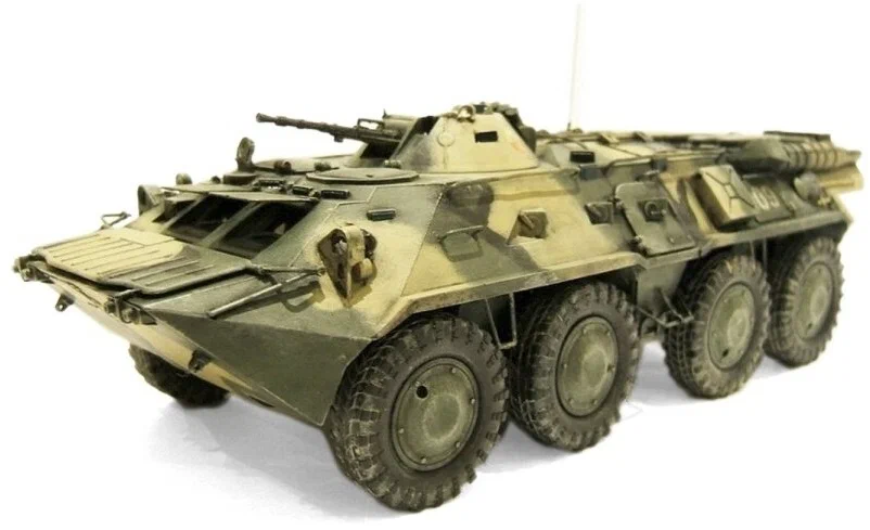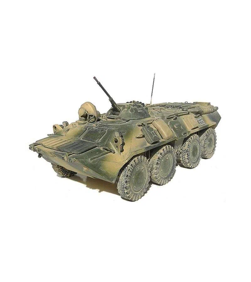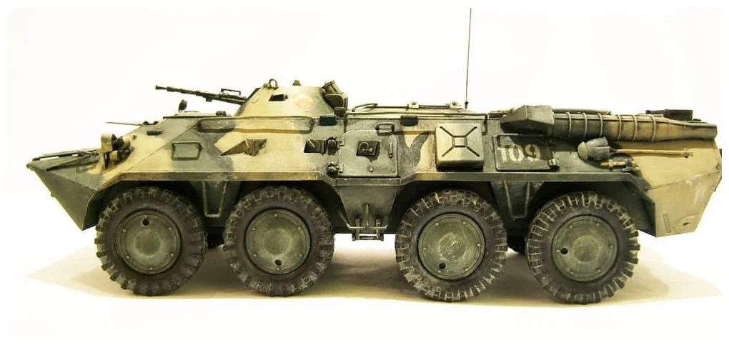 Детализированная конструкция: Модель воспроизводит характерные черты БТР-80: восьмиколесную ходовую часть с независимой подвеской, сварную башню конической формы со спаренной пулеметной установкой, двухстворчатые бортовые двери для десанта и характерные люки в крыше корпуса.