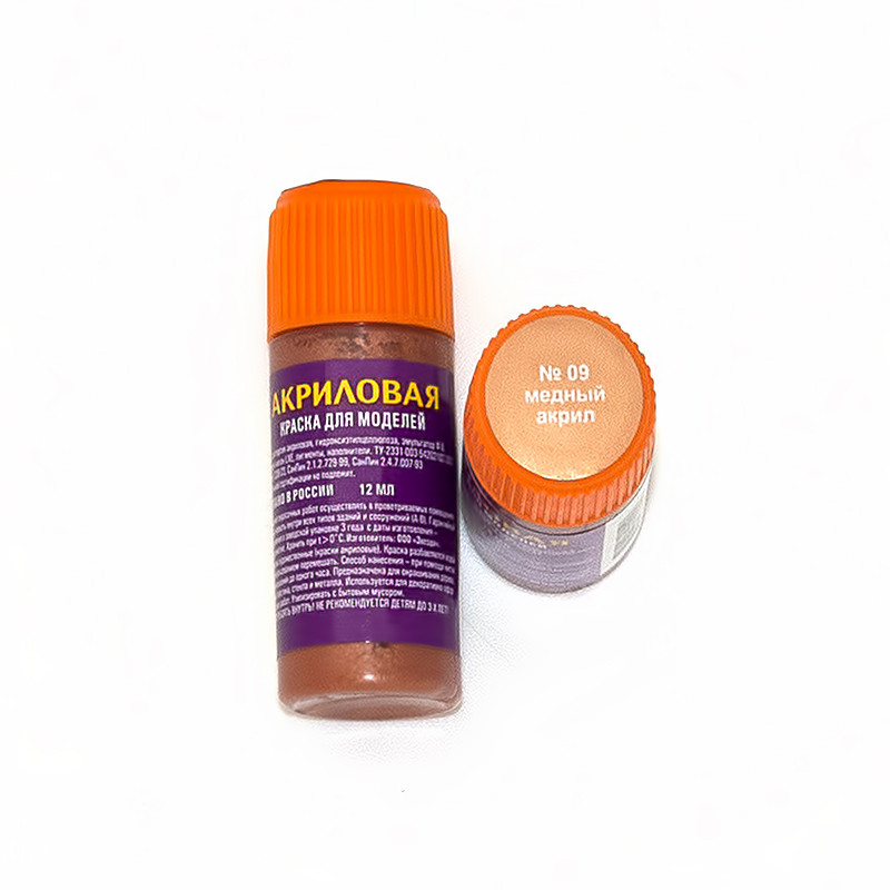 Краска медного цвета с металлическим блеском. Идеально подходит для окраски моделей: сохнет полчаса, хорошо держится на дереве, пластмассе, металле.