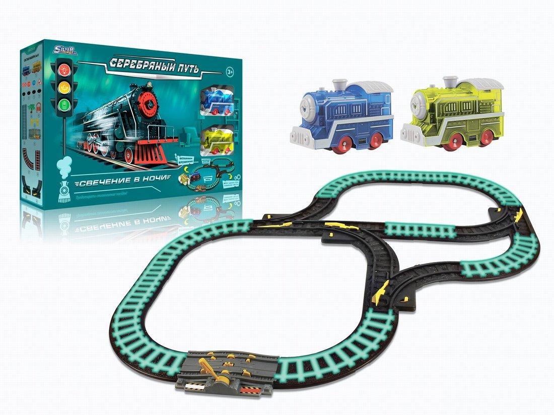 Железная дорога "Серебряный путь". Паровоз, рельсы и шпалы светятся в темноте. В комплект входят 2 паровоза. Паровоз можно остановить, используя специальный механизм остановки, или направить по другому пути, используя стрелки. Если этого не сделать, произойдёт крушение! В набор включены ворота (паровозик открывает ворота при движении, ворота закрываются сами).