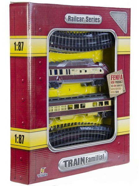 Набор детской железной дороги включает в себя поезд и вагон, рельсы. Рельсы можно выложить разной конфигурацией. Данный набор дает возможность выстраивать 1 круговую трассу.