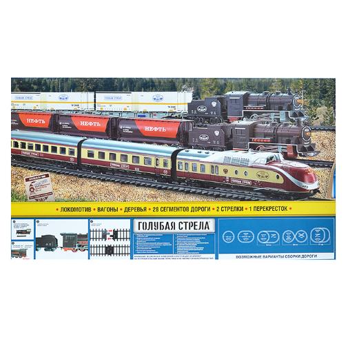 играть только в него, а можно собрать все комплекты и соорудить что-то невероятное! В набор данной железной дороги входят: паровоз, тендер, вагоны, деревья, элементы пути. Играть с этой «голубой стрелой» одно удовольствие. Длинная дорога (целых 600 см ! колея 24 мм ), а также звуковые, световые спецэффекты, - все это делает игру интересной и увлекательной. Железная дорога работает от 2 батареек типа АА. Возможны разные варианты сборки дороги.