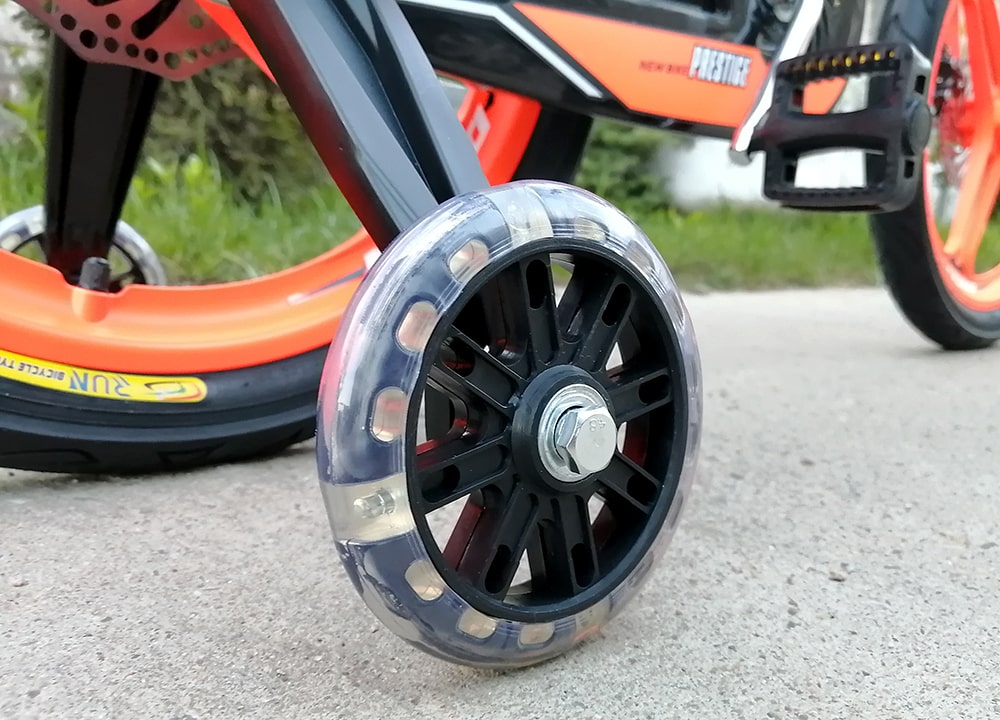 Размер колеса - 18``. Магниевые кронштейны тренировочных колёс, мягкие полиуретановые светящиеся приставные колёсики, передний и задний дисковый ручной тормоз v-brake, шлем и корзина в комплекте.