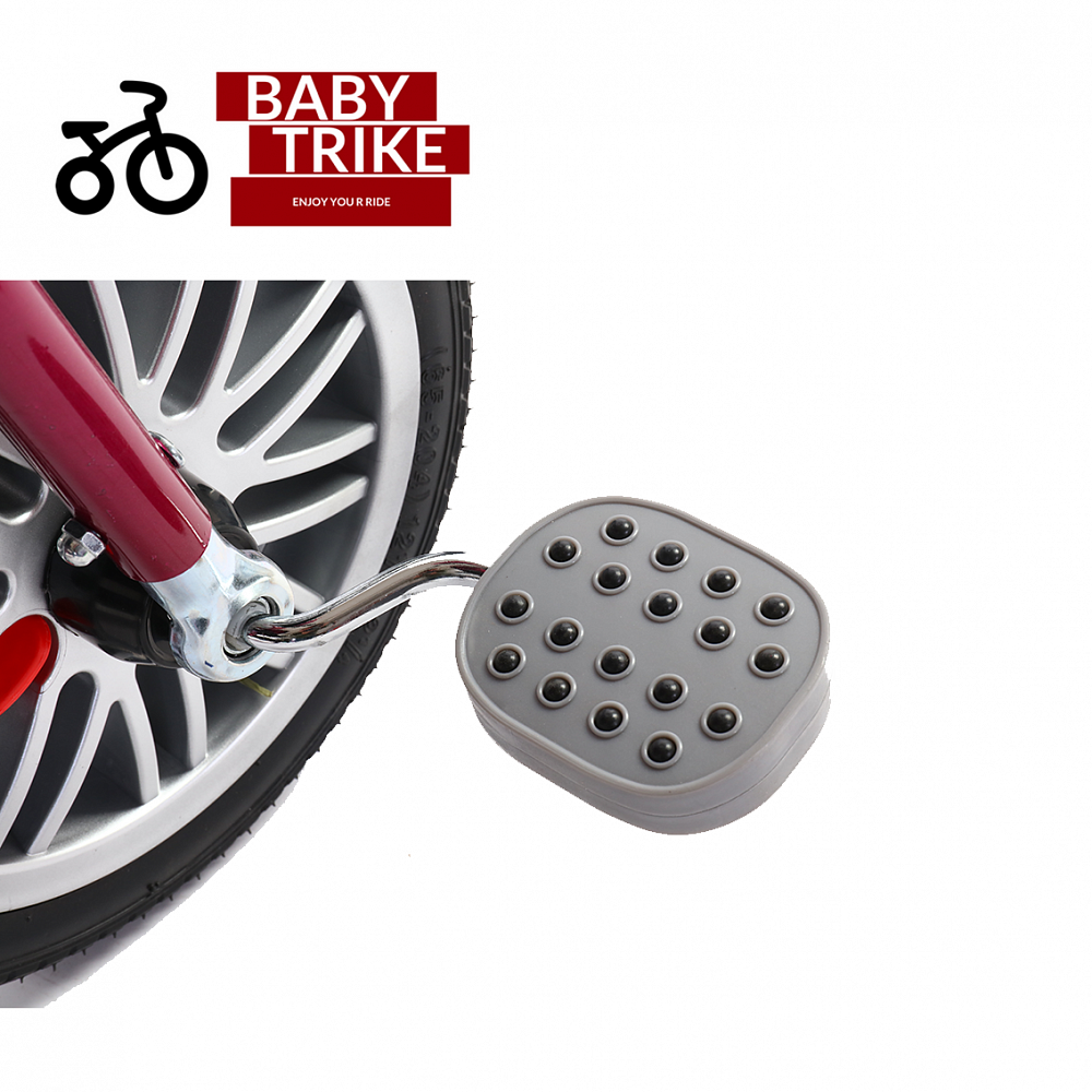 Регулируемая по высоте в 2-х положениях ручка управления. Фара со звукосветовыми эффектами. Уникальная окраска. Сплав рамы – углеродистая сталь. Фирменные диски. Крылья. Cтильное сиденье с искусственно-вышитым ромбовидным рисунком. Логотип BABY TRIKE на раме и крыше. Педали с антискользящими вкладками. Накладка из эко-кожи. Фирменный логотип на сумочке. Помимо складной убирающейся подножки для детей, которые уже сами достают до педалей, есть и дополнительные съемные подножки. Фирменная вместительная сумочка с ремнем на ручке управления (съемная). Корзина с крышкой.
